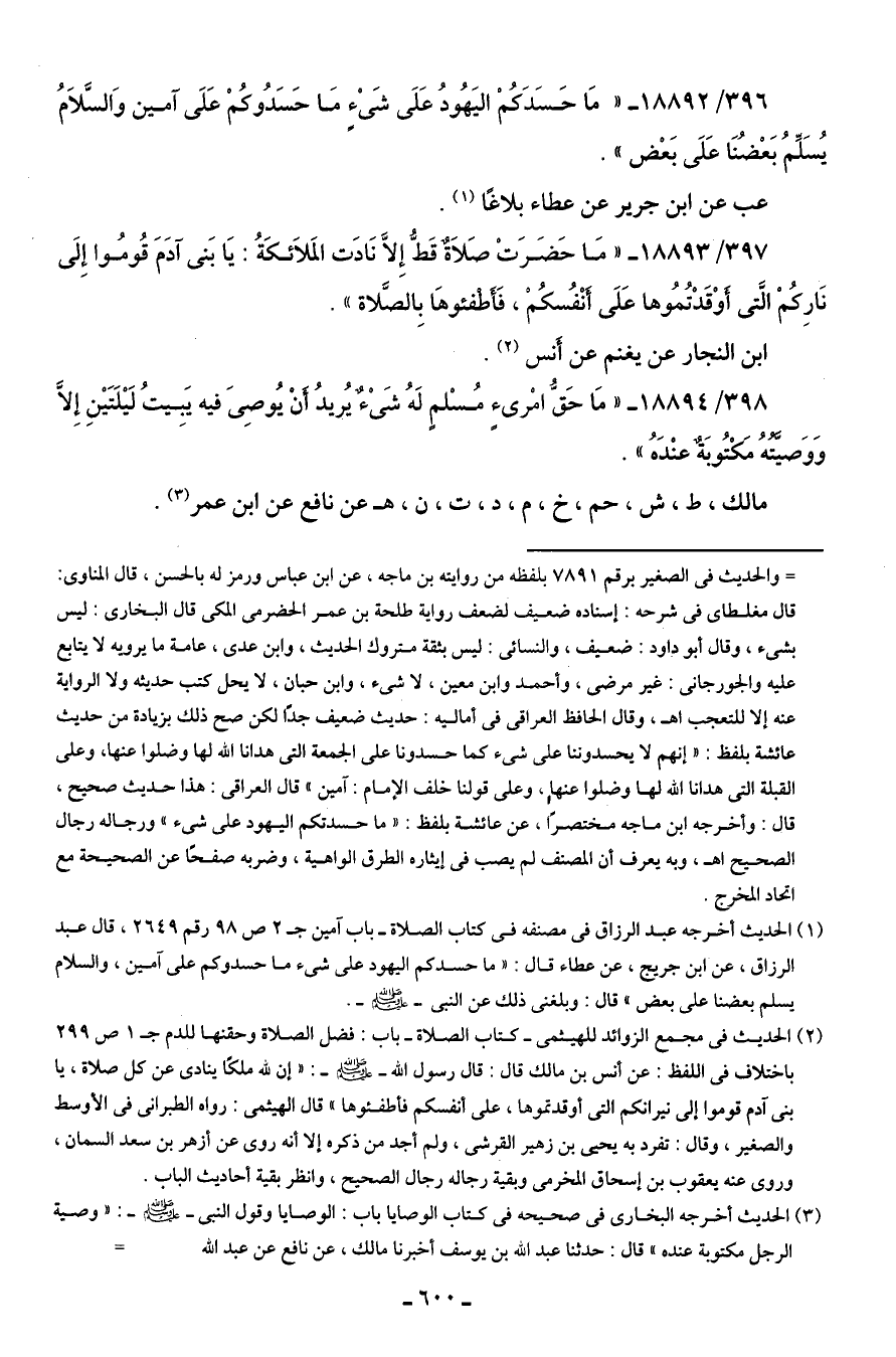 396/ 18892 - "مَا حَسَدَكمْ اليَهُودُ عَلَى شَيْءٍ مَا حَسَدُوكمْ عَلَى آمين وَالسَّلامُ يُسَلِّمُ بَعْضُنَا عَلَى بَعْض".