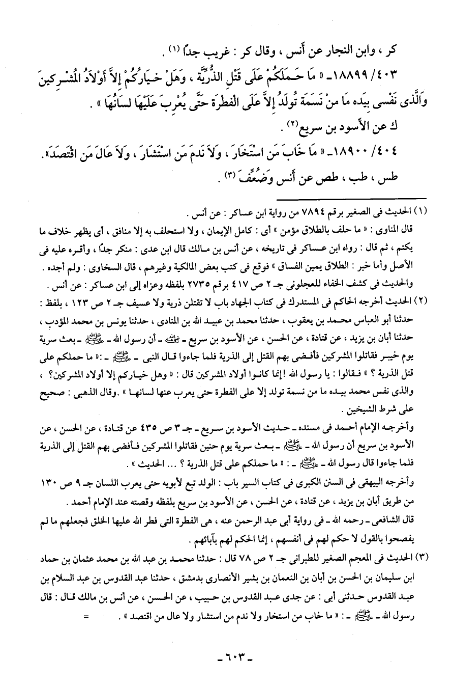 403/ 18899 - "مَا حَمَلَكُمْ عَلَى قَتْلِ الذُّرِّيَّة، وَهَلْ خيَارُكُمْ إِلَّا أَوْلادُ المُشْرِكينَ والَّذى نَفْسى بِيَده مَا منْ نَسَمَة تُولَدُ إِلَّا عَلَى الفطرَة حَتَّى يُعْرِب عَلَيهَا لسَانُهَا".