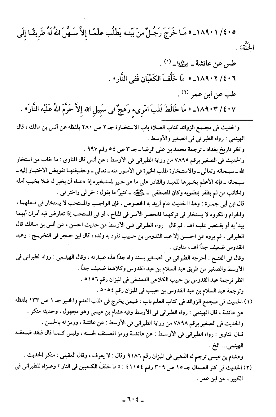 (¬1) الحديث في مجمع الزوائد في كتاب العلم باب: فيمن يخرج في طلب العلم والخير جـ 1 ص 133 بلفظه عن عائشة، قال الهيثمي: رواه الطبراني في الأوسط وفيه هشام بن عيسى وهو مجهول، وحديثه منكر.