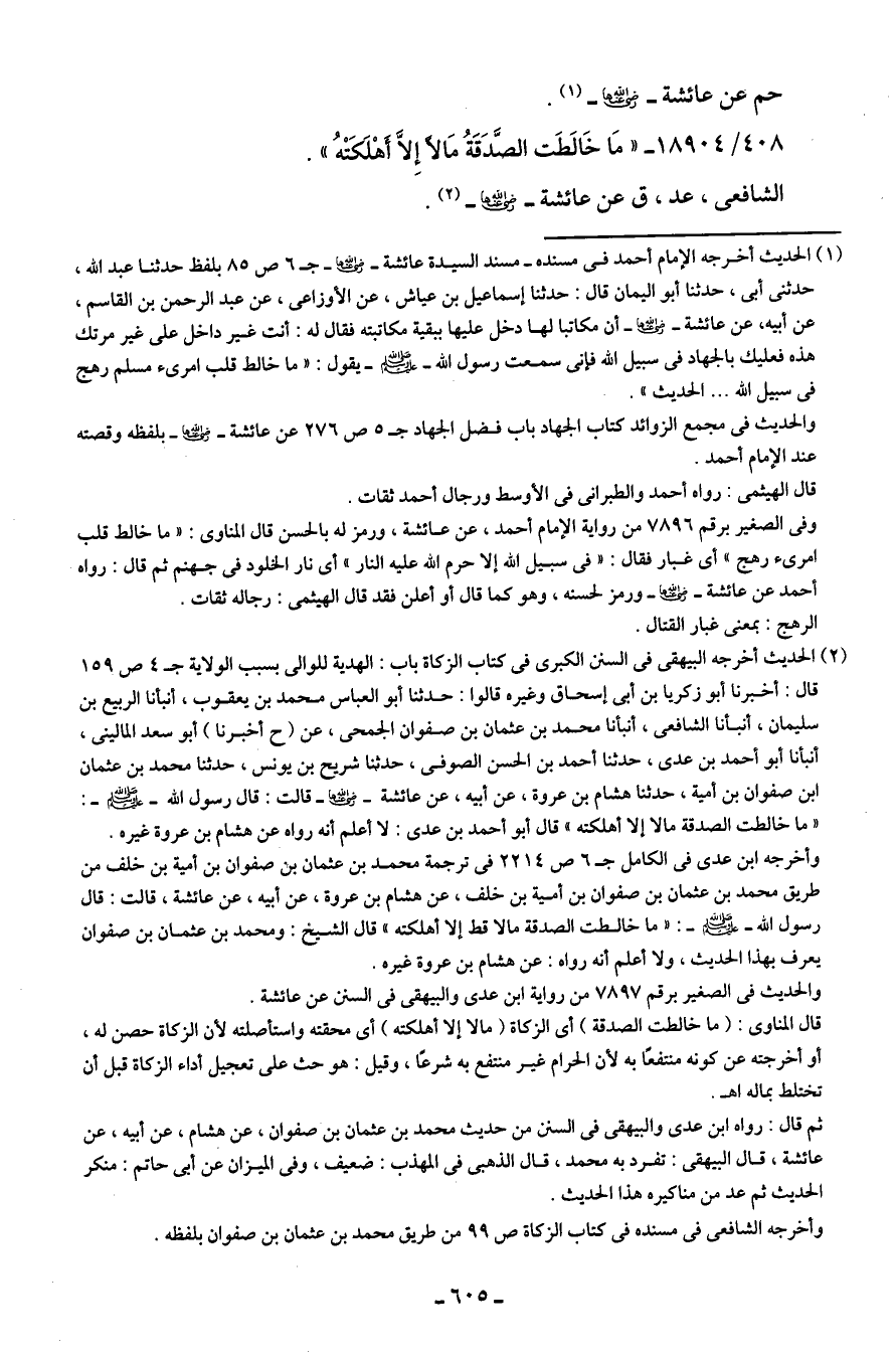 (¬2) الحديث أخرجه البيهقي في السنن الكبرى في كتاب الزكاة باب: الهدية للوالى بسبب الولاية جـ 4 ص 159 قال: أخبرنا أبو زكريا بن أبي إسحاق وغيره قالوا: حدثنا أبو العباس محمَّد بن يعقوب، أنبأنا الربيع بن سليمان، أنبأنا الشافعي، أنبأنا محمَّد بن عثمان بن صفوان الجمحى، عن (ح أخبرنا) أبو سعد المالينى، أنبأنا أبو أحمد بن علي، حدثنا أحمد بن الحسن الصوفى، حديث شريح بن يونس، حدثنا محمَّد بن عثمان بن صفوان بن أمية، حدثنا هشام بن عروة، عن أبيه، عن عائشة - رضي الله عنها - قالت: قال رسول الله - صلى الله عليه وسلم -: "ما خالطت الصدقة مالًا إلا أهلكته" قال أبو أحمد بن علي: لا أعلم أنه رواه عن هشام بن عروة غيره.