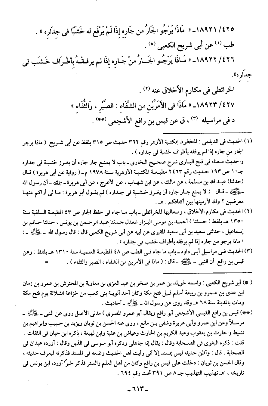 (¬1) الحديث في الديلمى: المخطوط بمكتبة الأزهر رقم 362 حديث ص 315 بلفظ عن أبي شريح (ماذا يرجو الجار من جاره إذا لم يرفقه بأطراف خشبة في جداره).