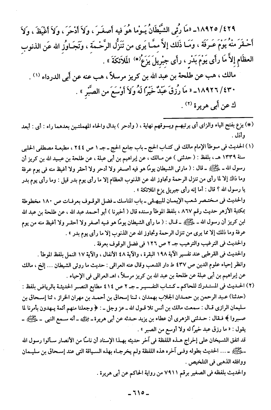 (¬1) الحديث في موطأ الإِمام مالك في كتاب الحج -باب جامع الحج- جـ 1 صـ 244، مطبعة مصطفى الحلبى سنة 1339 هـ، بلفظ: (حدثني) عن هالك، عن إبراهيم بن أبي عبلة، عن طلحة بن عبيد الله بن كريز أن رسول الله - صلى الله عليه وسلم - قال: (ما رئى الشيطان يومًا هو فيه أصغر ولا أدحر ولا أحقر ولا أغيظ منه في يوم عرفة وما ذاك إلا لما رأى من تنزل الرحمة وتجاوز الله عن الذنوب العظام إلا ما رأى يوم بدر قيل: وما رأى يوم بدر يا رسول الله؟ قال: أما إنه رأى جبريل يزع الملائكة".