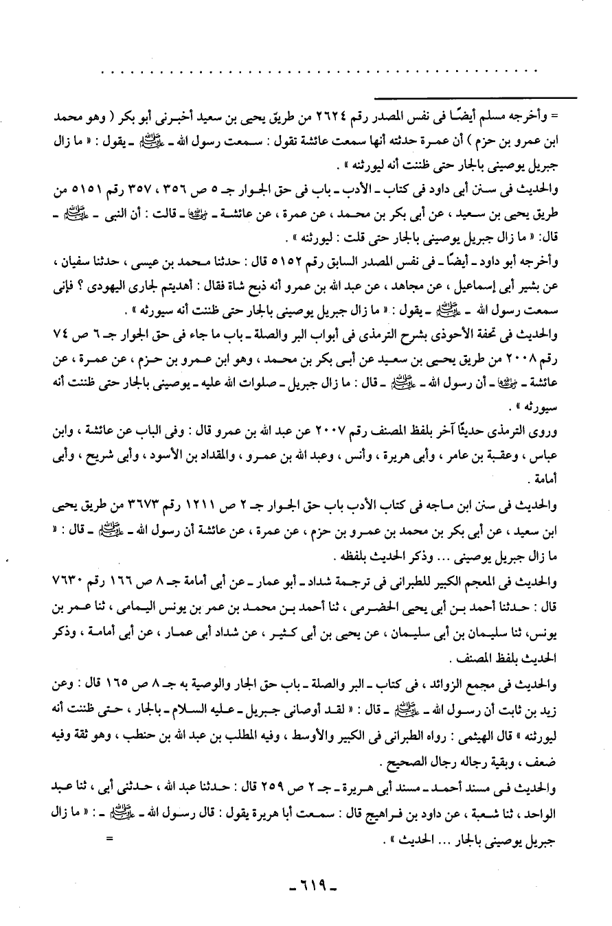 والحديث في سنن أبي داود في كتاب -الأدب- باب في حق الجوار جـ 5 ص 356، 357 رقم 5151 من طريق يحيى بن سعيد، عن أبي بكر بن محمَّد، عن عمرة، عن عائشة - رضي الله عنها - قالت: أن النبي - صلى الله عليه وسلم - قال: "ما زال جبريل يوصينى بالجار حتى قلت: ليورثنه".