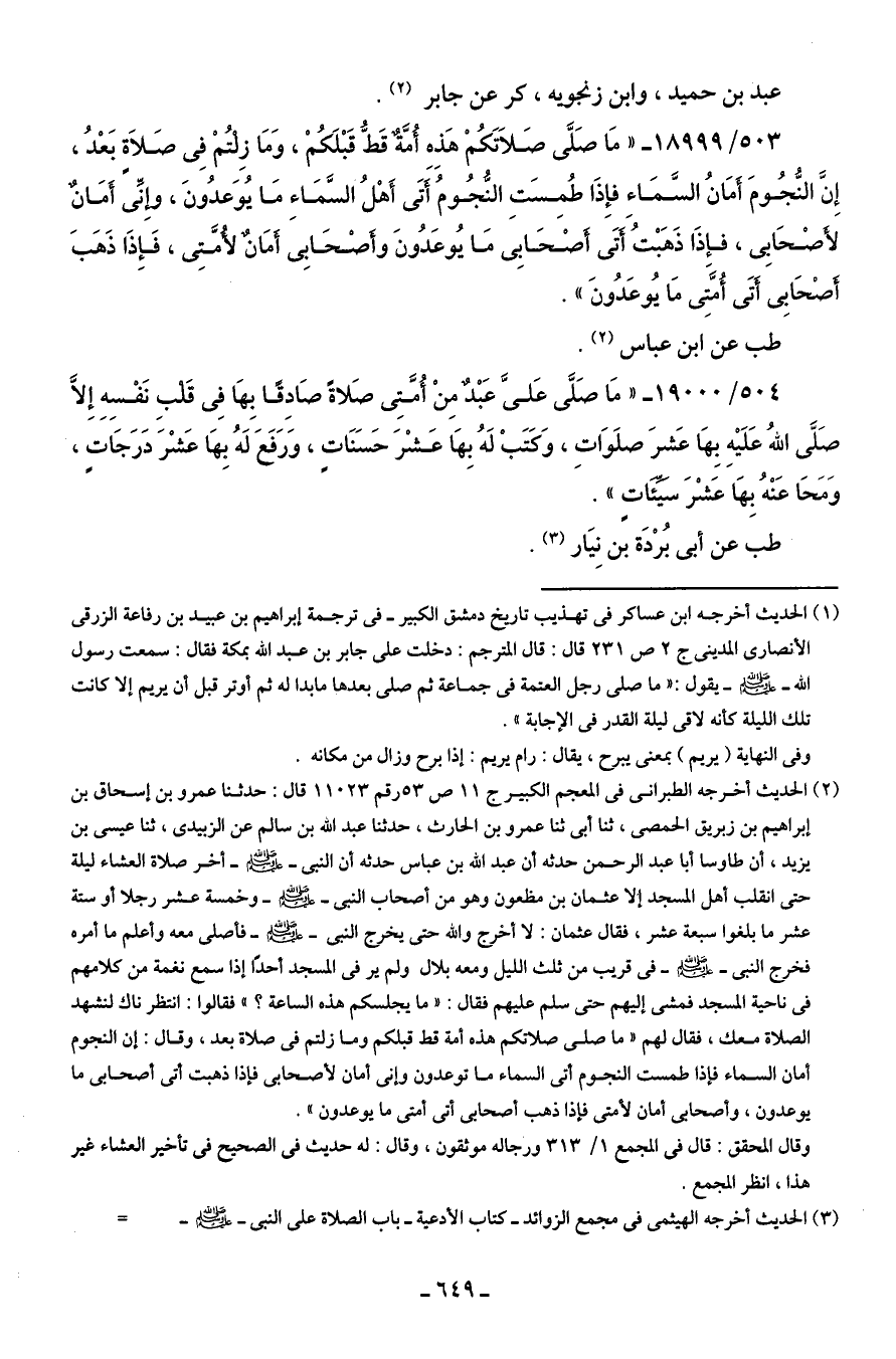 503/ 18999 - "مَا صَلَّى صَلَاتَكُمْ هَذِهِ أُمَّةٌ قَطُّ قَبْلَكُمْ، وَمَا زِلْتُمْ في صَلَاةٍ بَعْدُ، إِنَّ النُّجُومَ أَمَانُ السَّمَاءِ فإِذَا طُمِسَتِ النُّجُومُ أَتَى أَهْلُ السَّمَاءِ مَا يُوعَدُونَ، وإِنِّى أَمَانٌ لأَصْحَابِى، فإِذَا ذَهَبْتُ أَتَى أَصْحَابِى مَا يُوعَدُونَ وأَصْحَابِى أَمَانٌ لأُمَّتِى، فَإِذَا ذَهَبَ أَصْحَابِى أَتَى أُمَّتِي مَا يُوعَدُونَ".