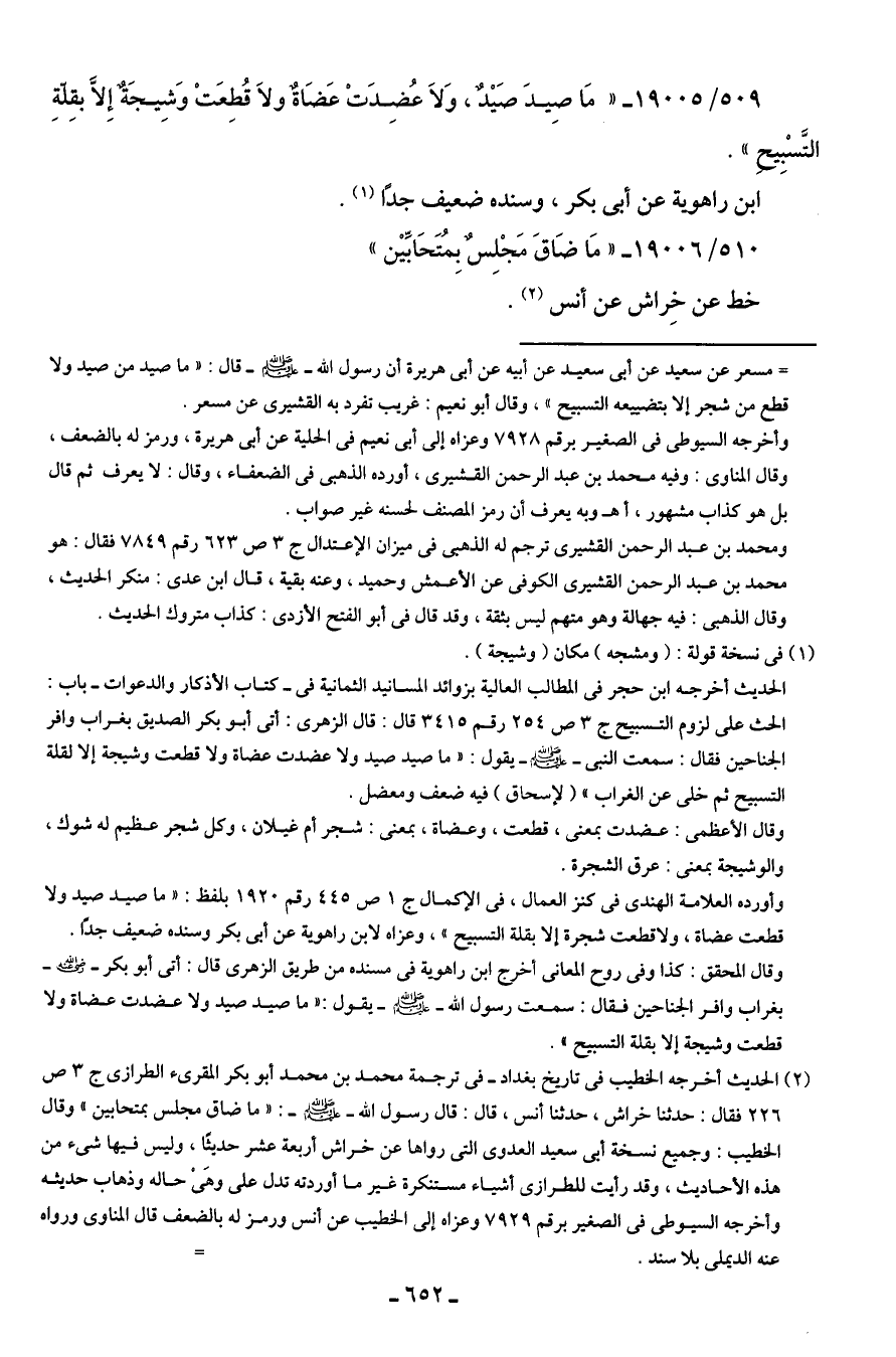 وأورده العلامة الهندى في كنز العمال، في الإكمال ج 1 ص 445 رقم 1920 بلفظ: "ما صيد صيد ولا قطعت عضاة، ولا قطعت شجرة إلا بقلة التسبيح"، وعزاه لابن راهوية عن أبي بكر وسنده ضعيف جدًّا.