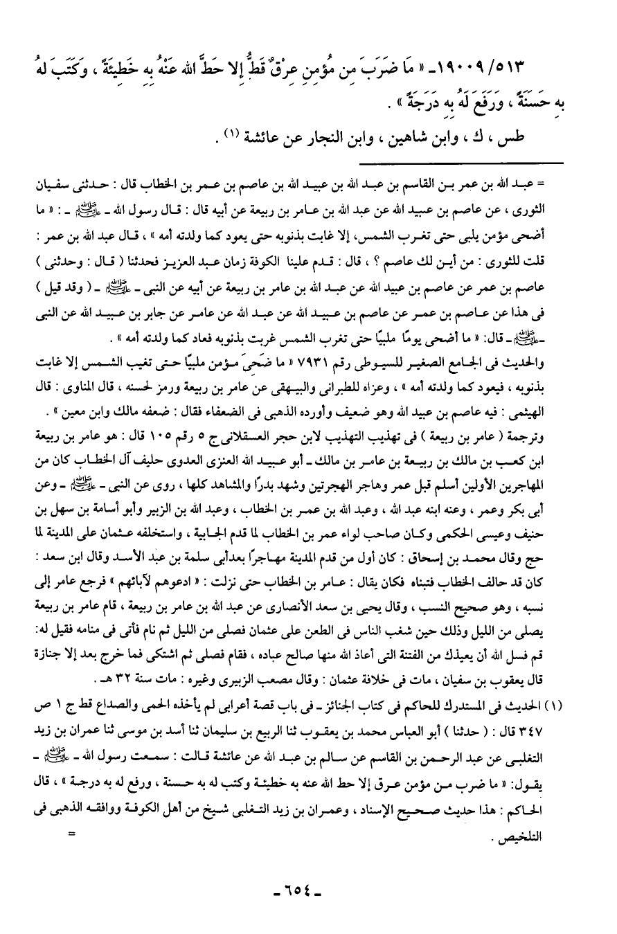 (¬1) الحديث في المستدرك للحاكم في كتاب الجنائز - في باب قصة أعرابي لم يأخذه الحمى والصداع قط ج 1 ص 347 قال: (حدثنا) أبو العباس محمَّد بن يعقوب ثنا الربيع بن سليمان ثنا أسد بن موسى ثنا عمران بن زيد التغلبى عن عبد الرحمن بن القاسم عن سالم بن عبد الله عن عائشة قالت: سمعت رسول الله - صَلَّى الله عليه وسلم - يقول: "ما ضرب من مؤمن عرق إلا حي الله عنه به خطيئة وكتب له به حسنة، ورفع له به درجة"، قال الحاكم: هذا حديث صحيح الإسناد، وعمران بن زيد التغلبى شيخ من أهل الكوفة ووافقه الذهبي في التلخيص. =
