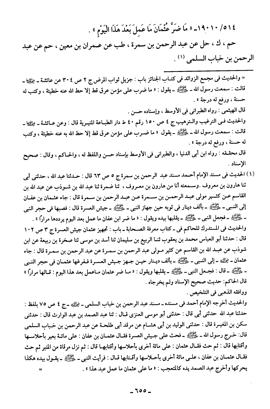 514/ 19010 - "مَا ضَرَّ عُثْمَانَ مَا عَمِلَ بَعْدَ هَذَا الْيَوْمِ".