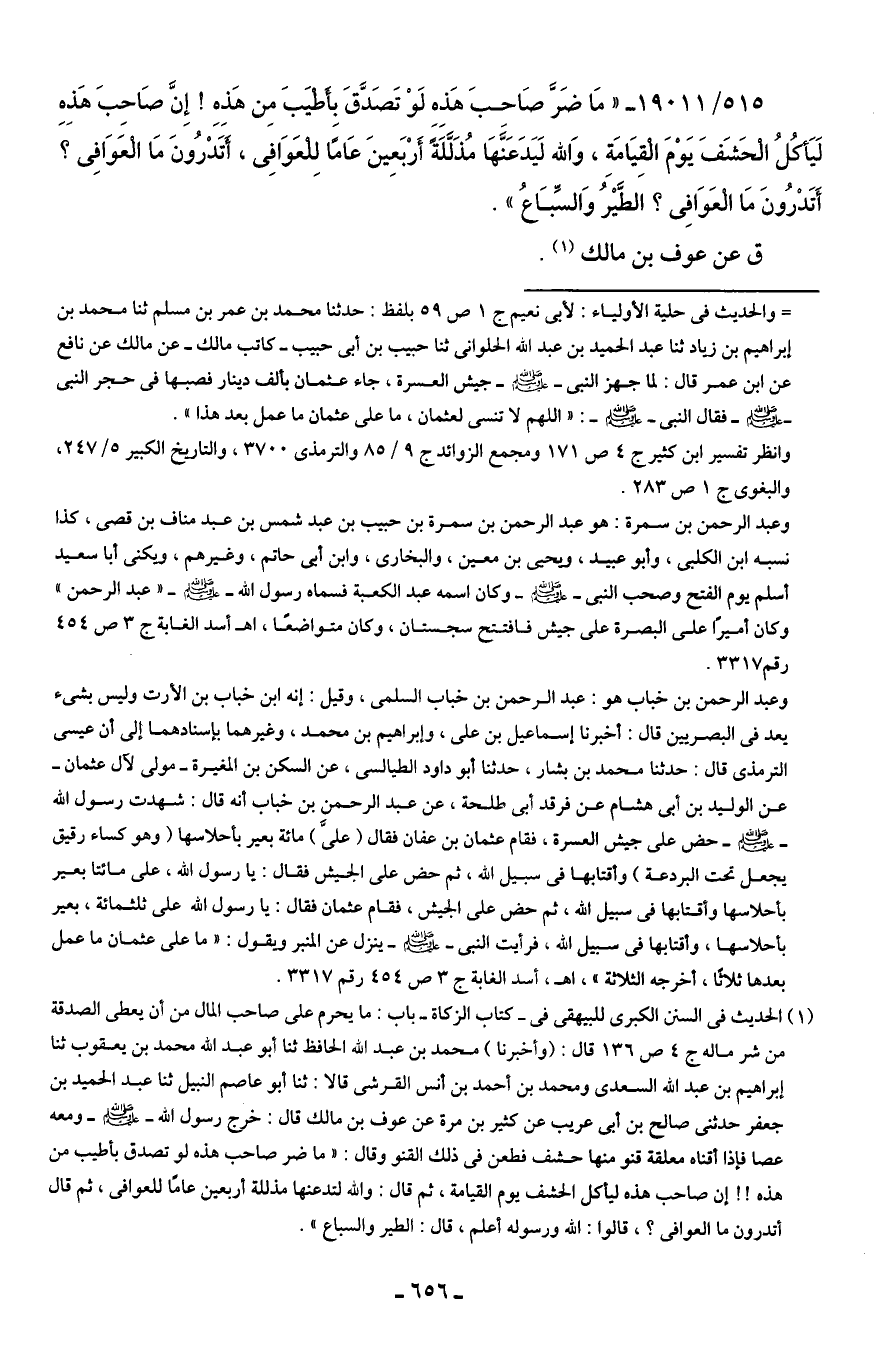(¬1) الحديث في السنن الكبرى للبيهقي في -كتاب الزكاة- باب: ما يحرم على صاحب المال من أن يعطى الصدقة من شر ماله ج 4 ص 136 قال: (وأخبرنا) محمَّد بن عبد الله الحافظ ثنا أبو عبد الله محمَّد بن يعقوب ثنا إبراهيم بن عبد الله السعدى ومحمد بن أحمد بن أنس القرشيّ قالا: ثنا أبو عاصم النبيل ثنا عبد الحميد بن جعفر حدثني صالح بن أبي عريب عن كثير بن مرة عن عوف بن مالك قال: خرج رسول الله - صَلَّى الله عليه وسلم - ومعه عصا فإذا أقناه معلقة قنو منها حشف فطعن في ذلك القنو وقال: "ما ضر صاحب هذه لو تصدق بأطيب من هذه! ! إن صاحب هذه ليأكل الحشف يوم القيامة، ثم قال: والله لتدعنها مذللة أربعين عامًا للعوافى، ثم قال أتدرون ما العوافى؟ ، قالوا: الله ورسوله أعلم، قال: الطير والسباع".