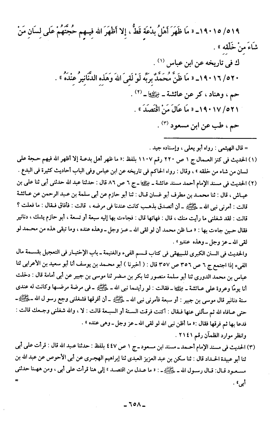 (¬1) الحديث في كنز العمال ج 1 ص 220 رقم 1107 بلفظ: "ما ظهر أهل بدعة إلا أظهر الله فيهم حجة على لسان من شاء من خلقه"، وقال: رواه الحاكم في تاريخه عن ابن عباس وفي الباب أحاديث كثيرة في البدع.