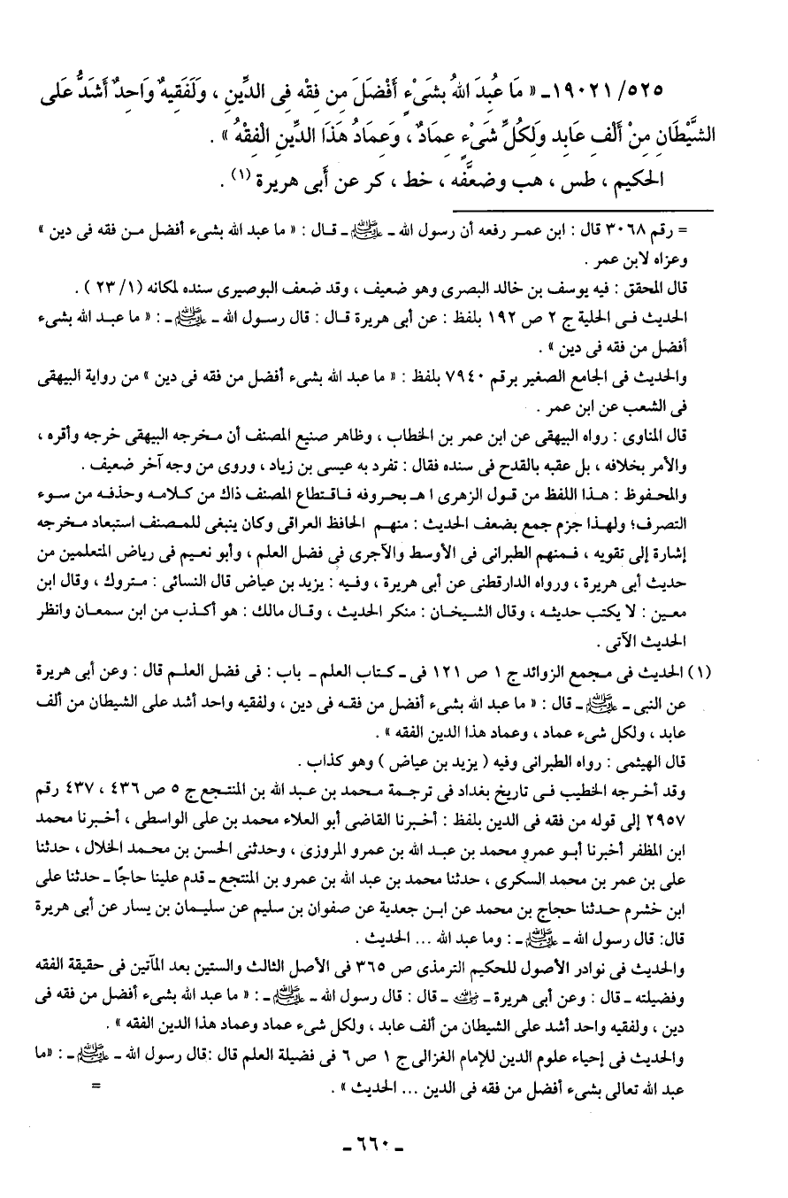 525/ 19021 - "مَا عُبِدَ اللهُ بشَيْءٍ أَفْضَلَ مِن فِقْه في الدِّينِ، وَلَفَقِيهٌ وَاحِدٌ أَشَدُّ عَلى الشَّيطَانِ مِنْ أَلْفِ عَابِد وَلِكُلِّ شَيءٍ عِمَادٌ، وَعِمَادُ هَذَا الدِّينِ الْفِقْهُ".