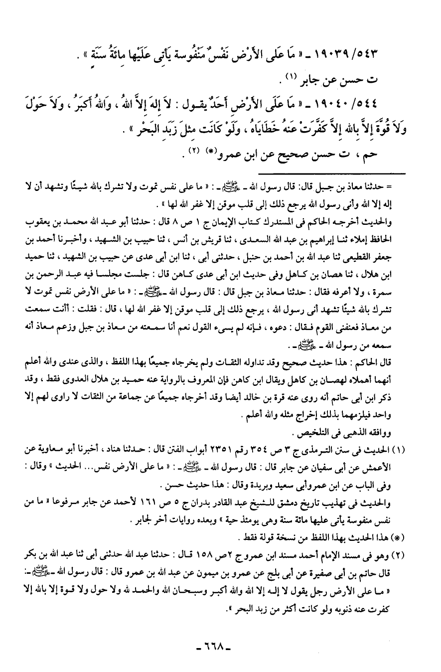 (¬2) وهو في مسند الإمام أحمد مسند ابن عمرو ج 2 ص 158 قال: حدثنا عبد الله حدثني أبي ثنا عبد الله بن بكر قال حاتم بن أبي صفيرة عن أبي بلج عن عمرو بن ميمون عن عبد الله بن عمرو قال: قال رسول الله - صلى الله عليه وسلم -: "ما على الأرض رجل يقول لا إله إلا الله والله أكبر وسبحان الله والحمد لله ولا حول ولا قوة إلا بالله إلا كفرت عنه ذنوبه ولو كانت أكثر من زيد البحر".