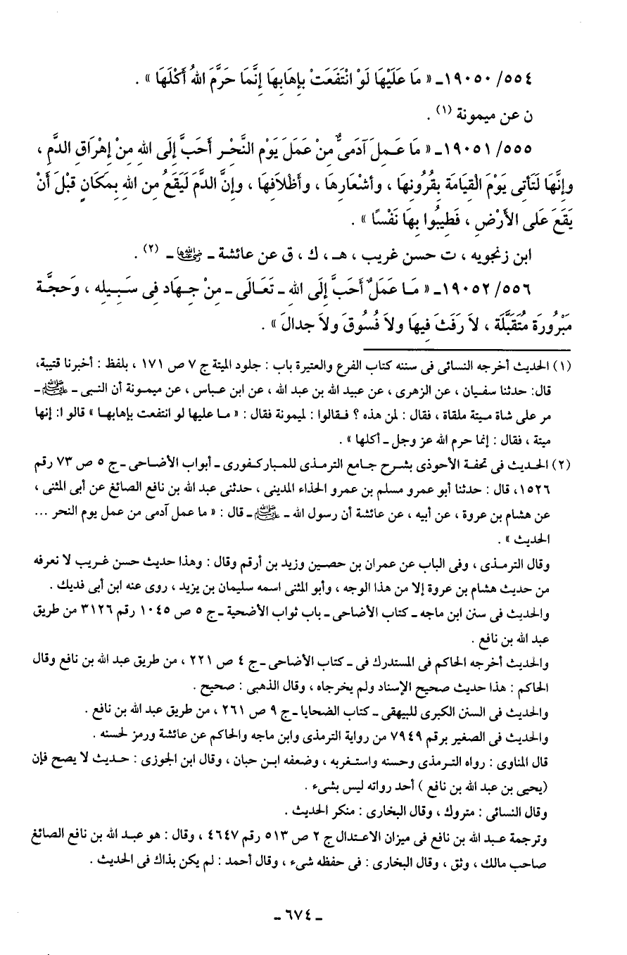 (¬2) الحديث في تحفة الأحوذي بشرح جامع الترمذي للمباركفورى- أبواب الأضاحي- ج 5 ص 73 رقم 1526، قال: حدثنا أبو عمرو مسلم بن عمرو الحذاء المديني، حدثني عبد الله بن نافع الصائغ عن أبي المثنى، عن هشام بن عروة، عن أبيه، عن عائشة أن رسول الله - صلى الله عليه وسلم - قال: "ما عمل آدمى من عمل يوم النحر ... الحديث".