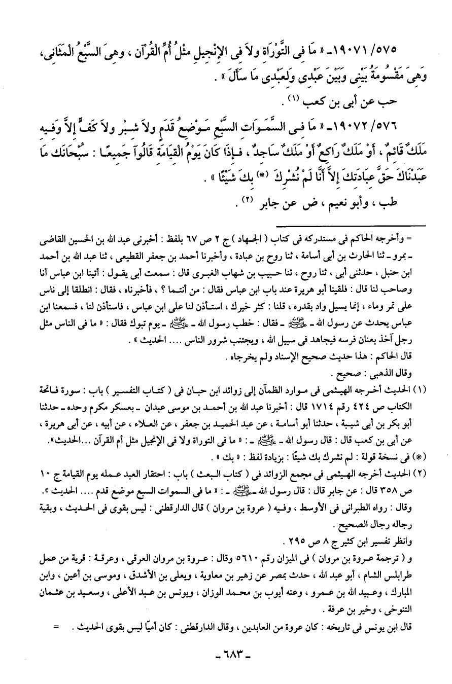 (¬1) الحديث أخرجه الهيثمي في موارد الظمآن إلى زوائد ابن حبان في (كتاب التفسير) باب: سورة فاتحة الكتاب ص 424 رقم 1714 قال: أخبرنا عبد الله بن أحمد بن موسى عبدان- بعسكر مكرم وحده- حدثنا أبو بكر بن أبي شيبة، حدثنا أبو أسامة، عن عبد الحميد بن جعفر، عن العلاء، عن أبيه، عن أبي هريرة، عن أبي بن كعب قال: قال رسول الله - صلى الله عليه وسلم -: "ما في التوراة ولا في الإنجيل مثل أم القرآن ... الحديث".