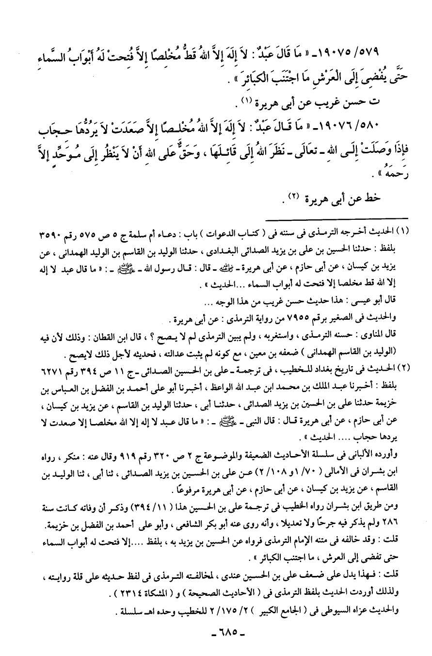 (¬2) الحديث في تاريخ بغداد للخطيب، في ترجمة- علي بن الحسين الصدائى- ج 11 ص 394 رقم 6271 بلفظ: أخبرنا عبد الملك بن محمد بن عبد الله الواعظ، أخبرنا أبو على أحمد بن الفضل بن العباس بن خزيمة حدثنا علي بن الحسين بن يزيد الصدائى، حدثنا أبي، حدثنا الوليد بن القاسم، عن يزيد بن كيسان، عن أبي حازم، عن أبي هريرة قال: قال النبي - صلى الله عليه وسلم -: "ما قال عبد لا إله إلا الله مخلصا إلا صعدت لا يردها حجاب. الحديث".