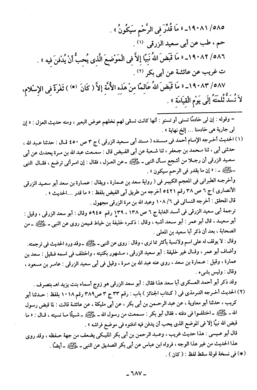 586/ 19082 - "مَا قَبَضَ اللهُ نَبِيًا إِلَّا فِي المَوْضِعَ الَّذي يُحبُّ أَنْ يُدْفنَ فيه".