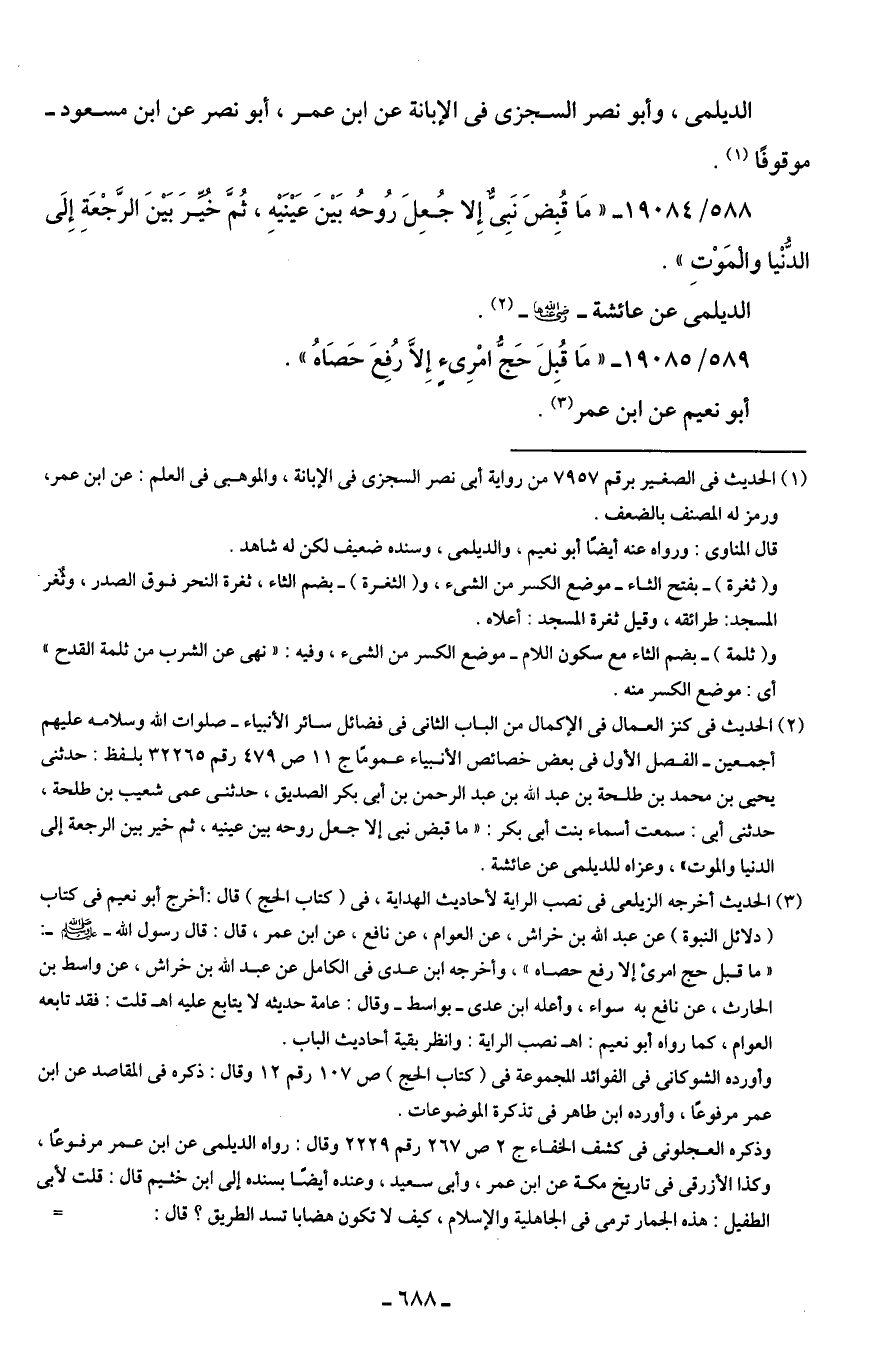 588/ 19084 - "مَا قُبِضَ نَبِيٌّ إِلا جُعِلَ رُوحُه بَينَ عَينَيهِ، ثُمَّ خُيِّرَ بَينَ الرَّجْعَةِ إِلَى الدُّنْيا والمَوْتِ".