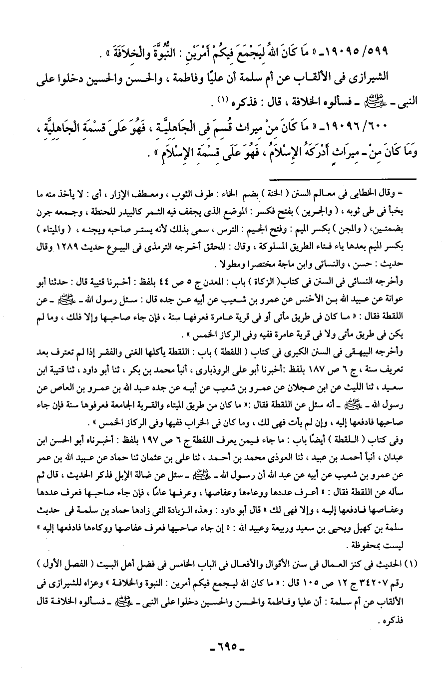 (¬1) الحديث في كنز العمال في سنن الأقوال والأفعال في الباب الخامس في فضل أهل البيت (الفصل الأول) رقم 34207 ج 12 ص 105 قال: "ما كان الله ليجمع فيكم أمرين: النبوة والخلافة" وعزاه للشيرازي في الألقاب عن أم سلمة: أن عليا وفاطمة والحسن والحسين دخلوا على النبي - صلى الله عليه وسلم - فسألوه الخلافة قال فذكره.