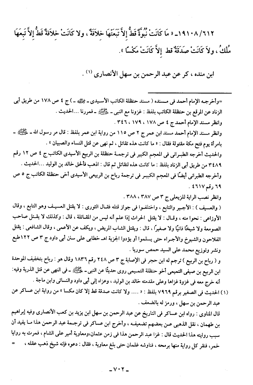 612/ 19108 - "مَا كَانَتْ نُبُوَّةٌ قَطُّ إِلَّا تَبَعَتْهَا خِلافَةٌ، ولا كَانَتْ خِلافةٌ قَطُّ إِلَّا تَبِعَهَا مُلْكُ، ولا كَانَتْ صَدَقَةٌ قط إِلَّا كَانَتْ مَكْسًا".