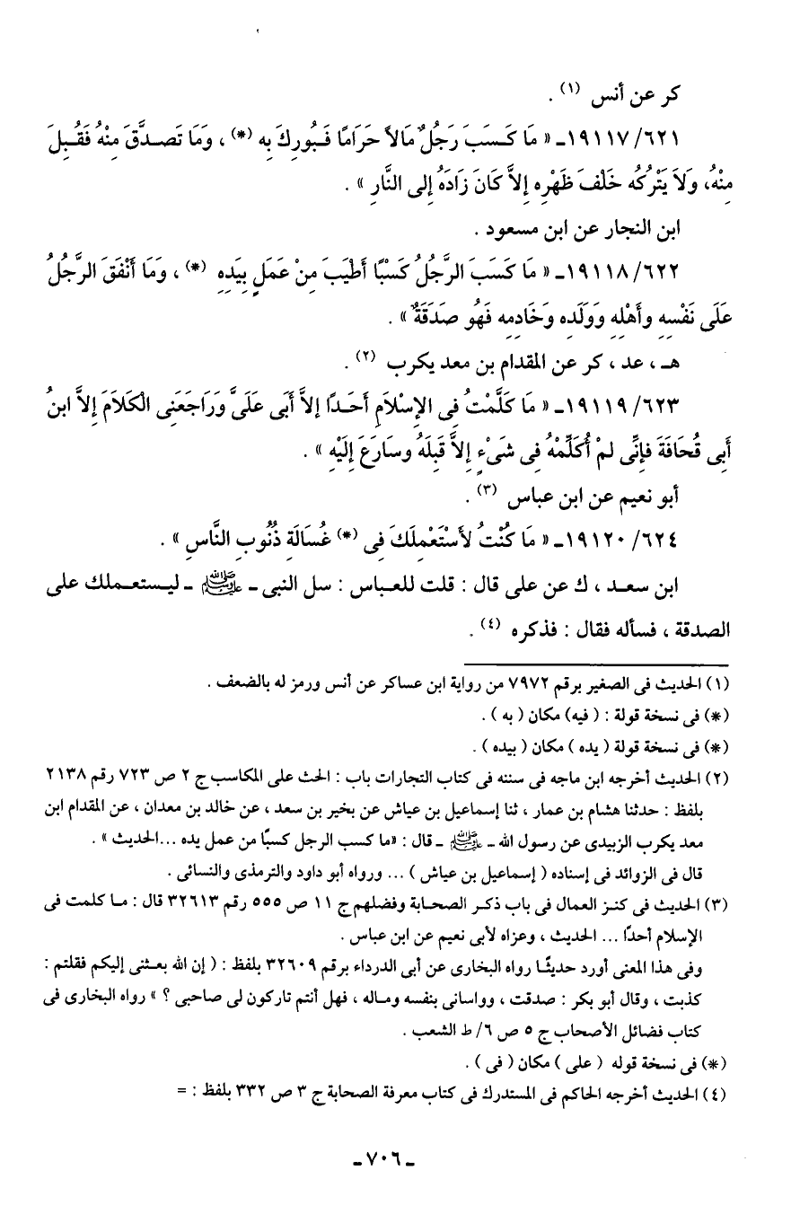 621/ 19117 - "مَا كَسَبَ رَجُلٌ مَالًا حَرَامًا فَبُورِكَ بِه (*)، وَمَا تَصدَّقَ مِنْهُ فَقُبِلَ مِنْهُ، وَلَا يَتْرُكُه خَلفَ ظَهْرِه إِلَّا كَانَ زَادَهُ إِلى النَّارِ".