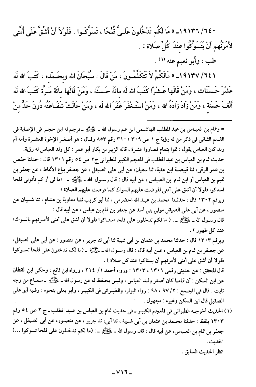 حديث تمام بن العباس بن عبد المطلب في المعجم الكبير للطبراني ج 2 ص 54 رقم 1301 قال: حدثنا حفص بن عمر الرقى، ثنا قبيصة ابن عقبة، ثنا سفيان، عن أبي على الصيقل، عن جعفر بياع الأنماط، عن جعفر بن تميم بن العباس أو ابن تمام بن العباس، عن أبيه قال: قال رسول الله - صلى الله عليه وسلم -: "ما لي أراكم تأتونى قلحا استاكوا فلولا أن أشق على أمتى لفرضت عليهم السواك كما فرضت عليهم الصلاة".