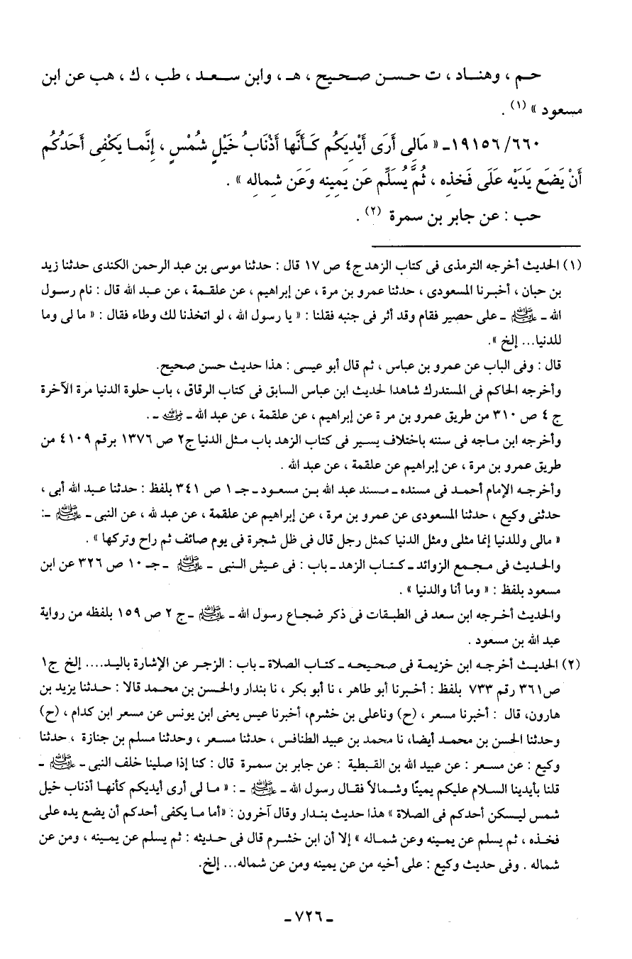 660/ 19156 - "مَا لِي أَرَي أَيدِيَكُم كَأَنَّها أَذْنَابُ خَيلٍ شُمْسٍ، إِنَّما يَكْفِي أَحَدُكُم أَنْ يَضَع يَدَيه عَلَى فَخذِه، ثُمَّ يُسَلِّم عَن يَمِينِه وَعَن شِمالِه".