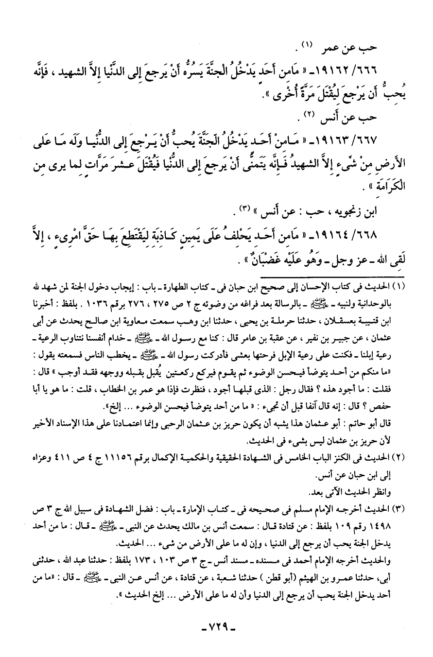666/ 19162 - "مَا مِن أحَد يَدْخُلُ الْجنَّةَ يَسُرُّه أَنْ يَرجعَ إِلى الدَّنْيا إلا الشهيد، فَإنَّه يُحِبُّ أَن يَرْجعَ ليُقْتَلَ مَرَّةً أُخْرى".