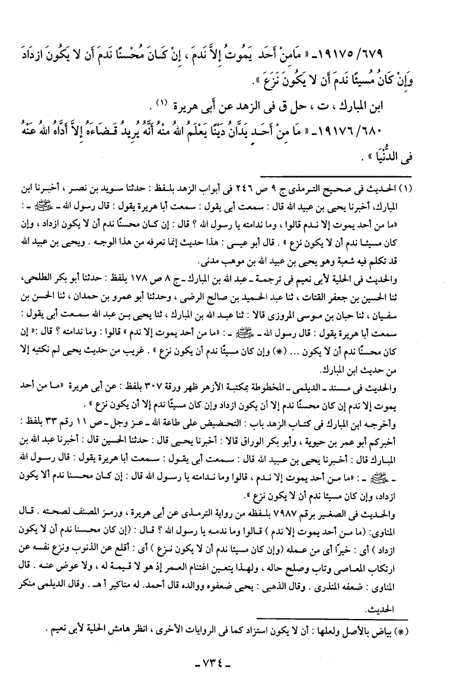 679/ 19175 - "مَا مِنْ أَحَد يَمُوتُ إلا نَدمَ، إِنْ كَانَ مُحْسنًا نَدمَ أَن لا يَكُونَ ازدَادَ وَإنْ كَانُ مُسيئًا نَدمَ أَن لا يَكُونَ نَزَعَ".