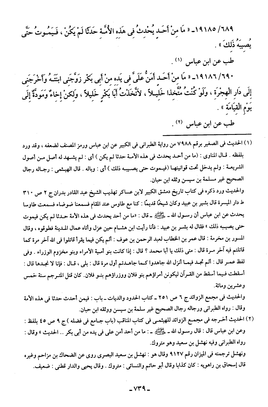 689/ 19185 - "مَا مِنْ أَحَدٍ يُحْدثُ فِي هَذِهِ الأُمَّة حَدَثًا لَمْ يَكُنْ، فَيَمُوتُ حَتَّى يُصيبَهُ ذَلِكَ".