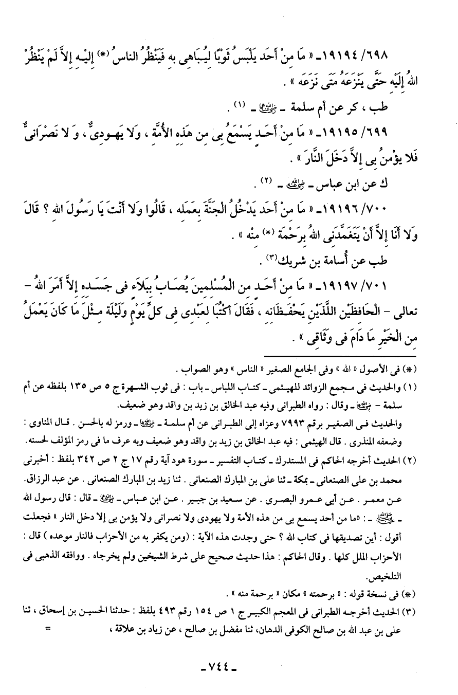 700/ 19196 - "مَا مِنْ أَحَد يَدْخُلُ الْجَنَّةَ بِعَمَلِه، قَالُوا وَلا أَنْتَ يَا رَسُولَ اللهِ؟ قَال وَلا أَنَا إلا أنْ يَتَغَمَّدَنِي اللهُ بِرَحْمَة (*) منْه".