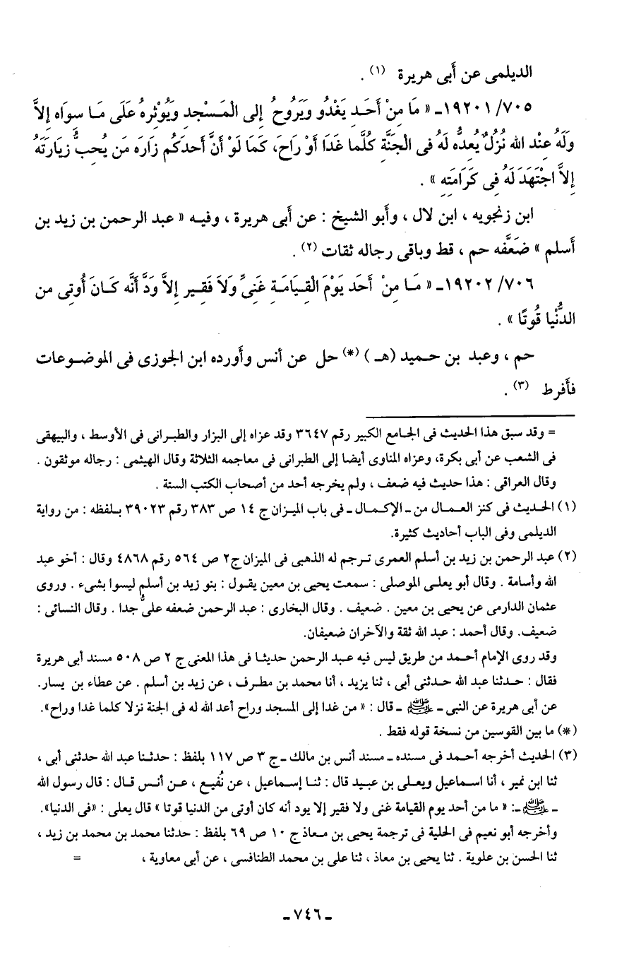 ابن زنجويه، ابن لال، وأَبو الشيخ: عن أبي هريرة، وفيه "عبد الرحمن بن زيد بن أَسلم" ضَعَّفه حم، قط وباقي رجاله ثقات (¬2).