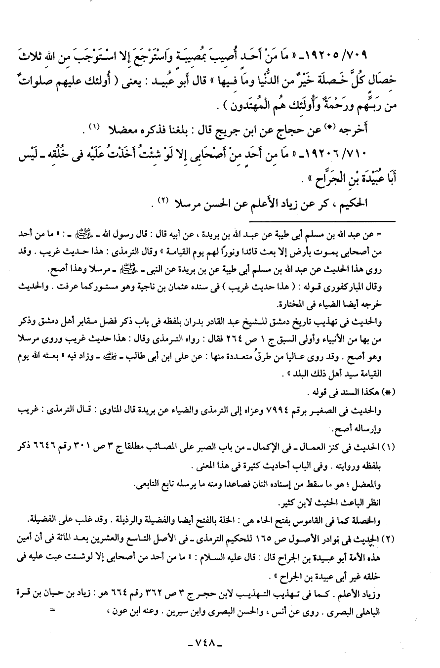 = عن عبد الله بن مسلم أبي طيبة عن عبد الله بن بريدة، عن أبيه قال: قال رسول الله - صلى الله عليه وسلم -: "ما من أحد من أصحابي يموت بأرض إلا بعث قائدا ونورًا لهم يوم القيامة" وقال الترمذي: هذا حديث غريب. وقد روي هذا الحديث عن عبد الله بن مسلم أبي طيبة عن بن بريدة عن النبي - صلى الله عليه وسلم - مرسلًا وهذا أصح.
