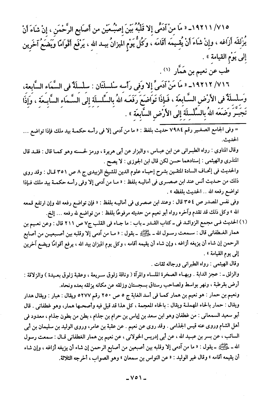 715/ 19211 - "مَا مِنْ آدَميٍّ إِلا قَلبُهُ بَينَ إِصْبُعَين من أصَابع الرَّحمَنِ، إِنْ شَاءَ أن يُزْلِقَه أزَاغه، وإنْ شَاءَ أن يُقِيمَه أقَامَه، وَكُلّ يَوْم الميزانُ بيد اللهِ، يَرْفَع أقْوَامًا وَيَضَعُ آخَرِين إِلى يَوْمِ القيامةِ".