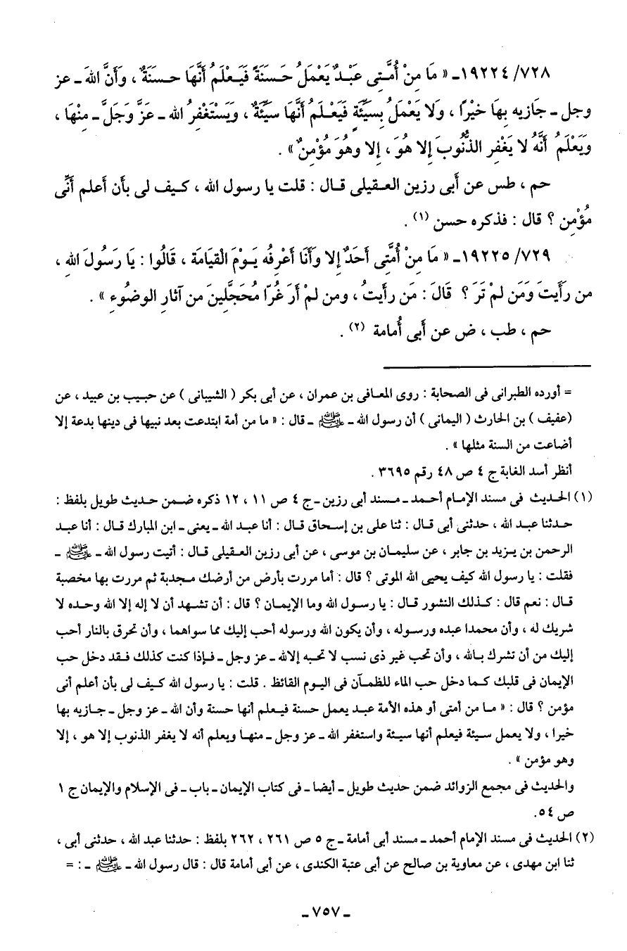728/ 19224 - "ما مِنْ أُمَّتِي عَبْدٌ يَعْمَلُ حَسَنَةً فَيَعْلَمُ أنَّهَا حسَنَة، وَأنَّ اللهَ -عز وجلَّ- جَازيه بِهَا خيرًا، وَلا يَعْمَلُ بِسيِّئةٍ فَيَعْلَمُ أنَّهَا سيِّئة، وَيَسْتَغْفِرُ الله -عَزَّ وَجَلَّ- مِنْهَا، وَيَعْلَمُ أنَّهُ لا يَغْفِر الذُّنوبَ إِلا هُوَ، إِلا وهُوَ مُؤْمِنٌ".