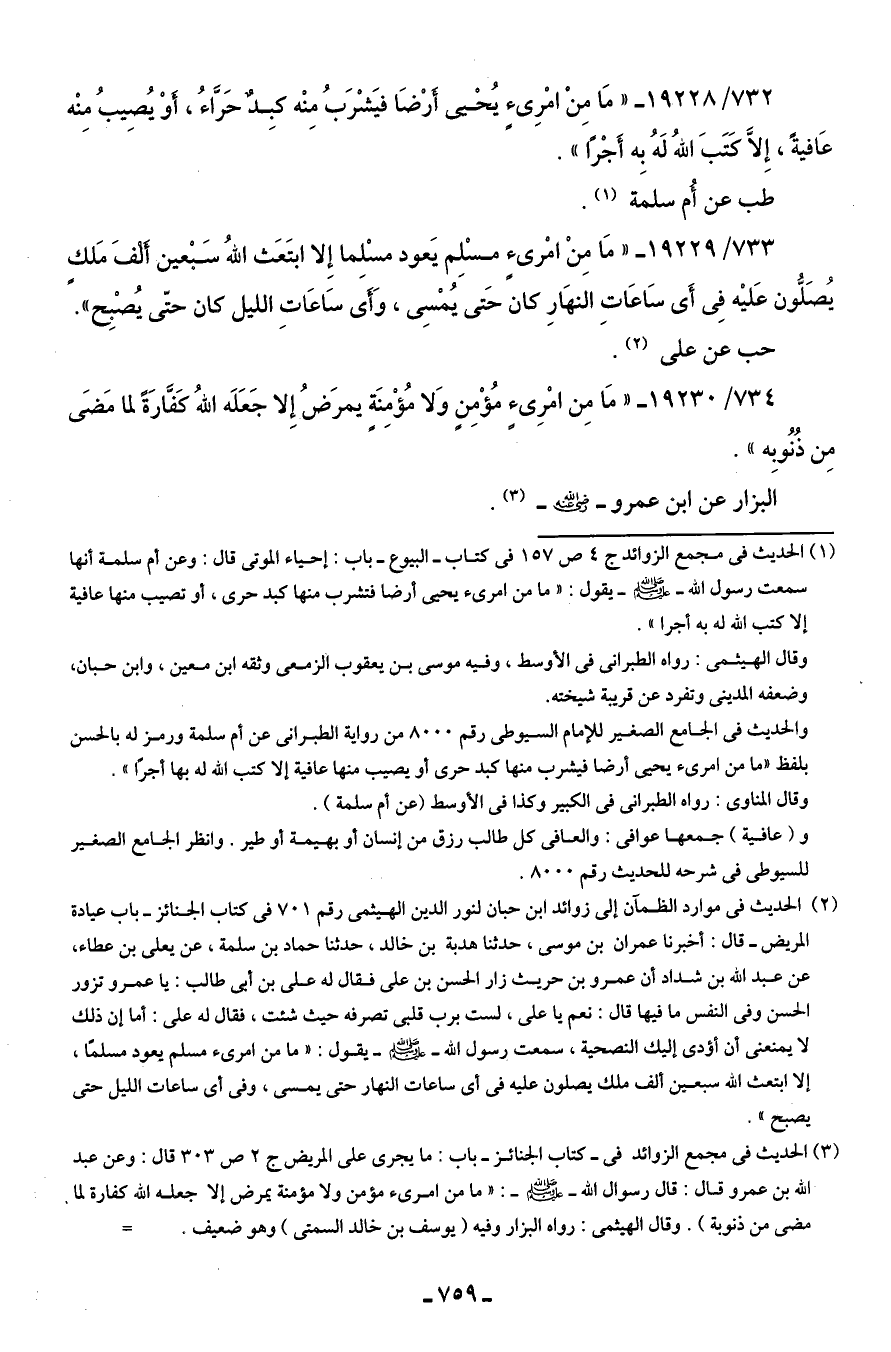 733/ 19229 - "مَا مِنْ امْرئٍ مسْلِم يَعود مسْلِمًا إِلا ابتَعَث اللهُ سَبْعين ألفَ مَلكٍ يُصَلُّون عَليه فِي أَي سَاعَاتِ النَّهَارِ كان حَتَّى يُمْسِى، وَأى سَاعَاتِ الليل كان حتّى يُصْبِح".