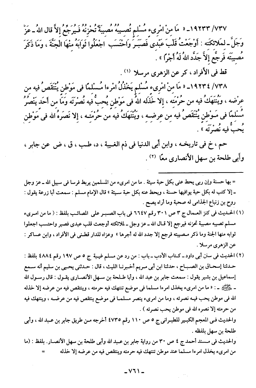 (¬2) الحديث في سنن أبي داود - كتاب الأدب - باب: من رد عن مسلم غيبة ج 5 ص 197 رقم 4884 بلفظ: حدَّثنا إسحاق بن الصباح، حدَّثنا ابن أبي مريم أخبرنا اللَّيث، قال: حدثني يَحْيَى بن سليم أنَّه سمع إسماعيل بن بشير يقول: سمعت جابر بن عبد الله، وأبا طلحة بن سهل الأنصاري يقول: قال رسول الله - صلى الله عليه وسلم -: "ما من امرئ يخذل امرءًا مسلمًا في موضع تنتهك فيه حرمته، ويتقص فيه من عرضه إلَّا خذله الله في موطن يحب فيه نصرته، وما من امرئ ينصر مسلمًا في موضع ينتقص فيه من عرضه، وينتهك فيه من حرمته إلَّا نصره الله في موطن يحب نصرته".