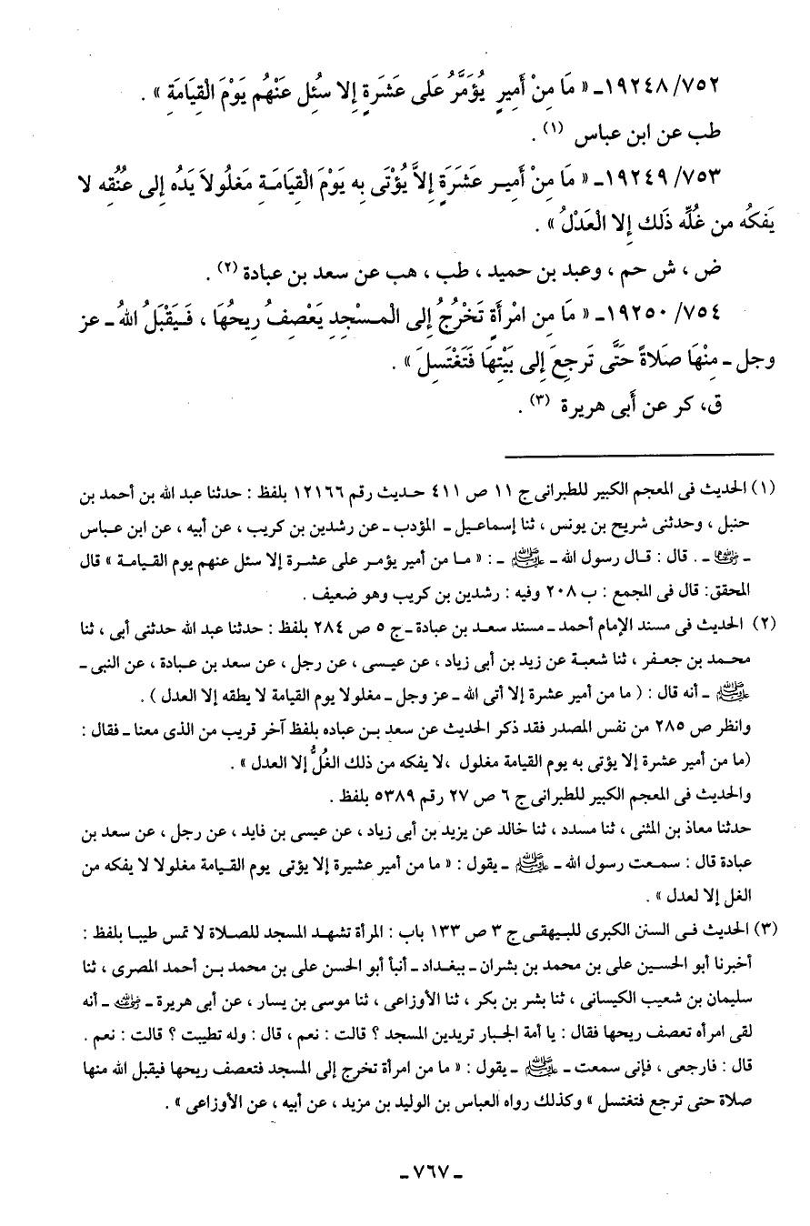 753/ 19249 - "مَا مِنْ أمِير عَشَرَة إلا يُؤْتَى به يَوْمَ القيامة مَغلُولا يَدُه إِلى عُنُقه لا يَفكُه من غلِّه ذَلك إِلا العَدْلُ".