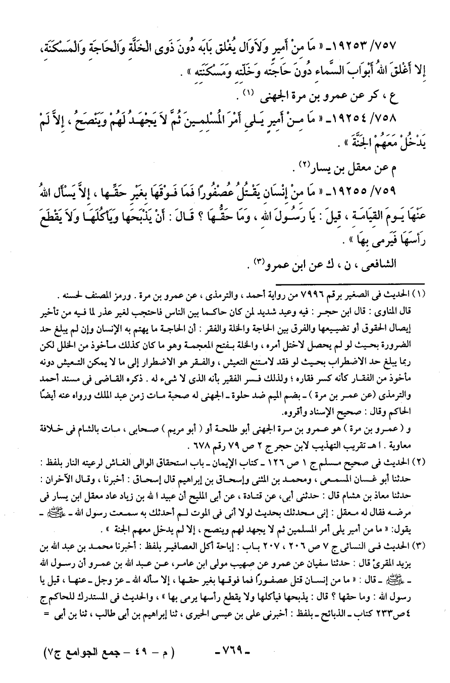 758/ 19254 - "مَا مِنْ أَمِيرٍ يَلي أَمْرَ المُسْلِمِينَ ثُمَّ لَا يَجْهَدُ لَهُمْ وَيَنْصَحُ، إلا لَمْ يَدْخُلْ مَعَهُمْ الجَنَّةَ".