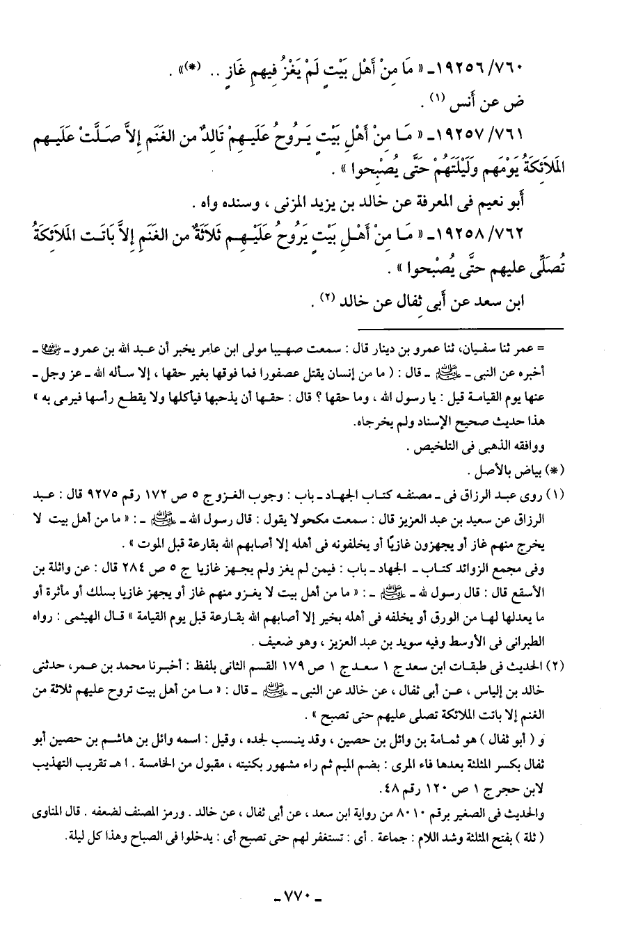 761/ 19257 - "مَا مِنْ أَهْلِ بَيتٍ يَرُوحُ عَلَيهِمْ تَالِدٌ من الغَنَم إلا صَلَّتْ عَلَيهم المَلائِكَةُ يَوْمَهم وَلَيلَتَهُمْ حَتَّى يُصْبِحوا".