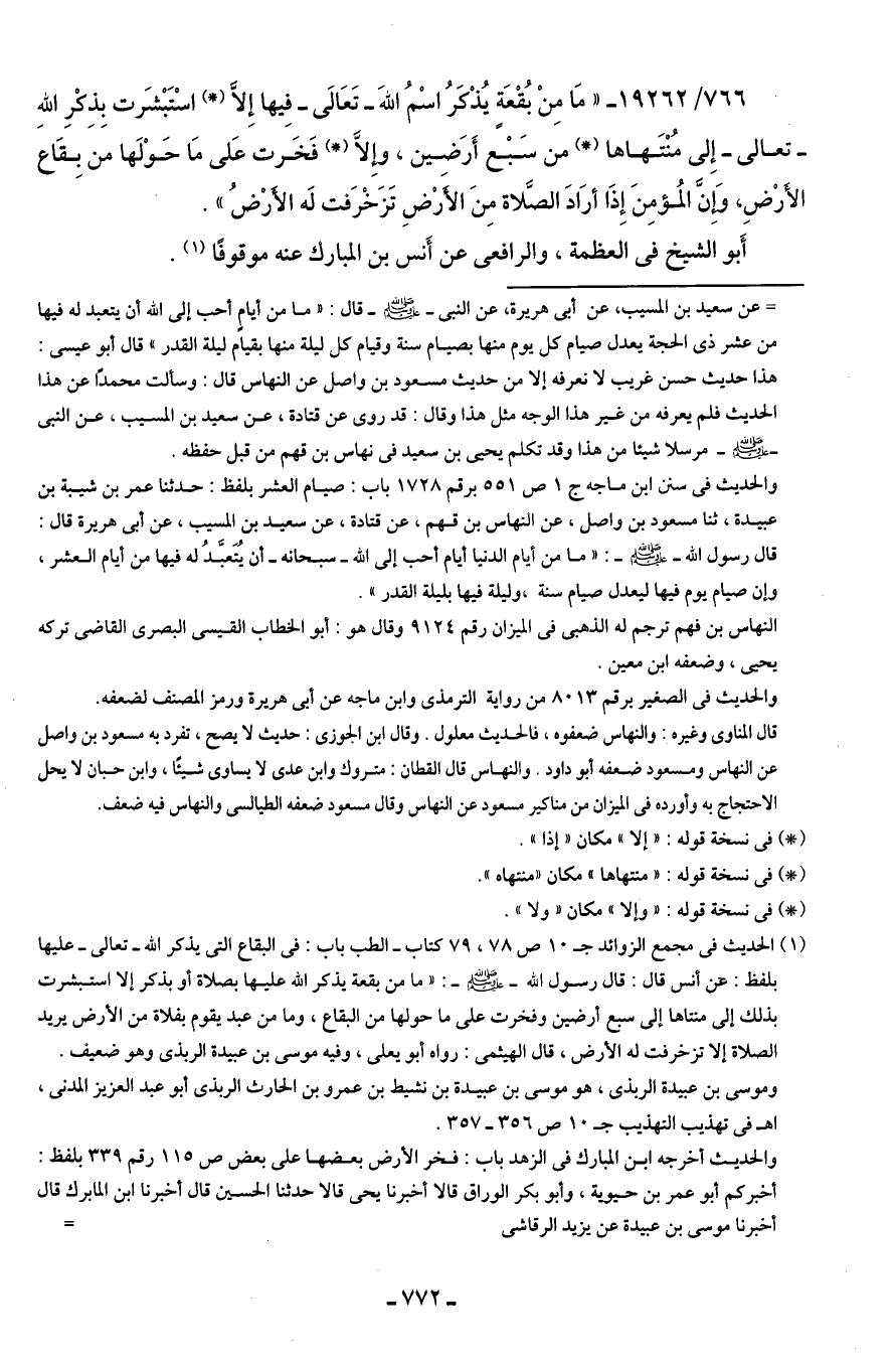 766/ 19262 - "مَا مِنْ بُقْعَةٍ يُذْكرُ اسْمُ اللهَ -تَعَالى- فِيها إلا (*) اسْتَبْشَرت بِذِكرِ اللهِ -تعالى- إِلى مُنْتَهاها (*) من سَبْع أَرَضين، وإلا (*) فَخَرت عَلى مَا حَوْلَها من بِقَاع الأرْضِ، وَإن المُؤمِنَ إِذَا أرَادَ الصَّلاة مِنَ الأَرْضِ تَزَخْرَفت لَه الأرْض".