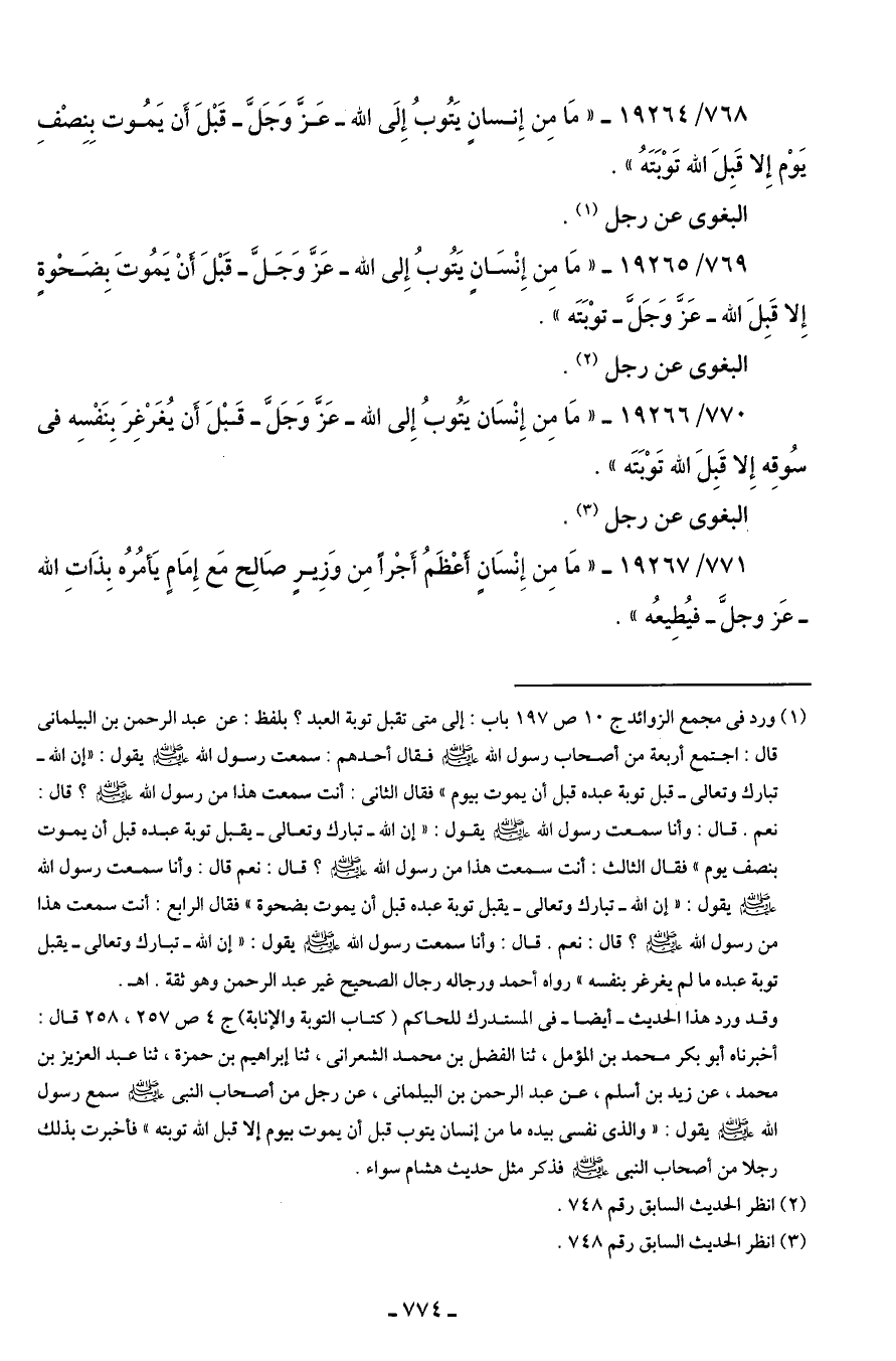 (¬1) ورد في مجمع الزوائد ج 10 ص 197 باب: إلى متى تقبل توبة العبد؟ بلفظ: عن عبد الرحمن بن البيلمانى قال: اجتمع أربعة من أصحاب رسول الله - صلى الله عليه وسلم - فقال أحدهم: سمعت رسول الله - صلى الله عليه وسلم - يقول: "إن الله -تبارك وتعالى- قبل توبة عبده قبل أن يموت بيوم" فقال الثَّاني: أنت سمعت هذا من رسول الله - صَلَّى الله عليه وسلم -؟ قال: نعم. قال: وأنا سمعت رسول الله - صلى الله عليه وسلم - يقول: "إن الله -تبارك وتعالى- يقبل توبة عبده قبل أن يموت بنصف يوم" فقال الثالث: أنت سمعت هذا من رسول الله - صلى الله عليه وسلم -؟ قال: نعم قال: وأنا سمعت رسول الله - صلى الله عليه وسلم - يقول: "إن الله -تبارك وتعالى- يقبل توبة عبده قبل أن يموت بضحوة" فقال الرابع: أنت سمعت هذا من رسول الله - صلى الله عليه وسلم -؟ قال: نعم. قال: وأنا سمعت رسول الله - صَلَّى الله عليه وسلم - يقول: "إن الله -تبارك وتعالى- يقبل توبة عبده ما لم يغرغر بنفسه" رواه أحمد ورجاله رجال الصَّحيح غير عبد الرحمن وهو ثقة. اهـ.