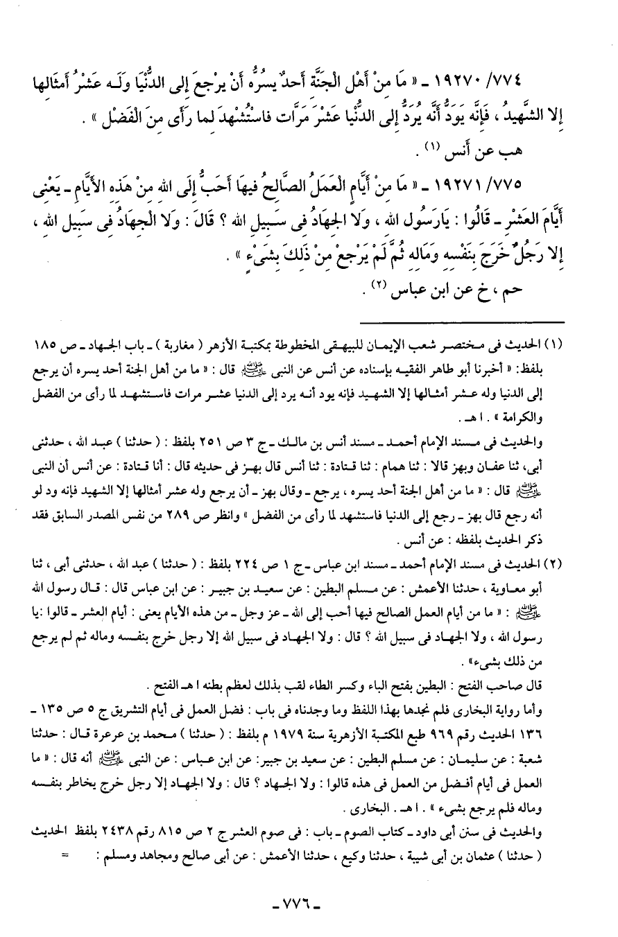 (¬2) الحديث في مسند الإمام أحمد - مسند ابن عباس- ج 1 ص 224 بلفظ: (حدَّثنا) عبد الله، حدثني أبي، ثنا أبو معاوية، حدَّثنا الأعمش: عن مسلم البطين: عن سعيد بن جبير: عن ابن عباس قال: قال رسول الله - صلى الله عليه وسلم -: "ما من أيَّام العمل الصالح فيها أحب إلى الله - عزَّ وجلَّ - من هذه الأيَّام يعني: أيَّام العشر- قالوا: يا رسول الله، ولا الجهاد في سبيل الله؟ قال: ولا الجهاد في سبيل الله إلَّا رجل خرج بنفسه وماله ثم لم يرجع من ذلك بشيء".