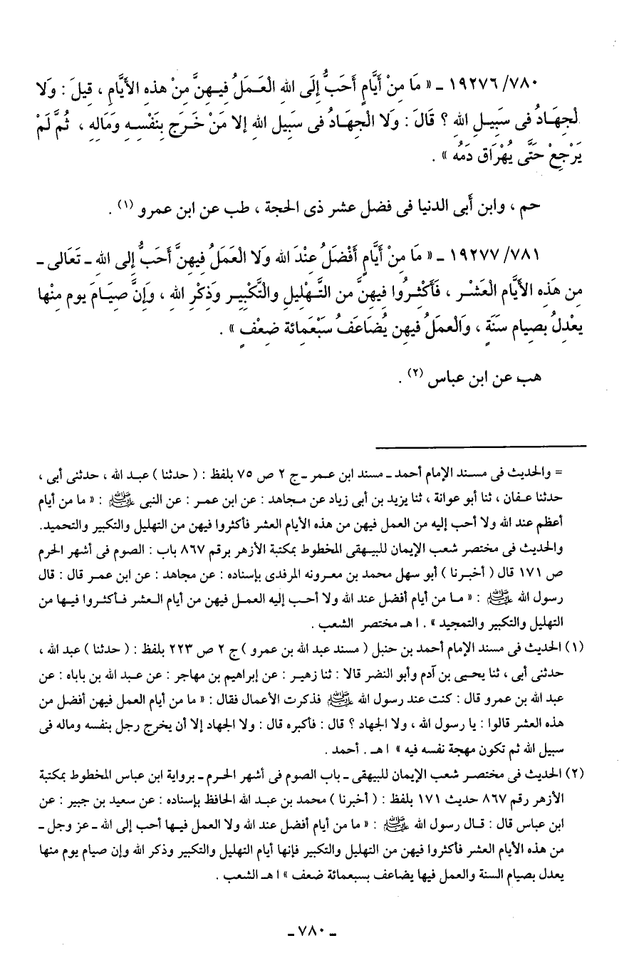 780/ 19276 - "مَا مِنْ أَيَّامٍ أَحَبُّ إِلَى اللهِ العَمَلُ فِيهِنَّ مِنْ هذهِ الأيَّامِ، قِيلَ: وَلا الجِهَادُ في سَبِيلِ اللهِ؟ قَال: وَلا الجِهَادُ في سَبِيل اللهِ إلَّا مَنْ خَرَج بِنَفْسِه وَمَاله، ثُمَّ لَمْ يَرْجِعْ حَتَّى يُهْرَاق دَمُه".