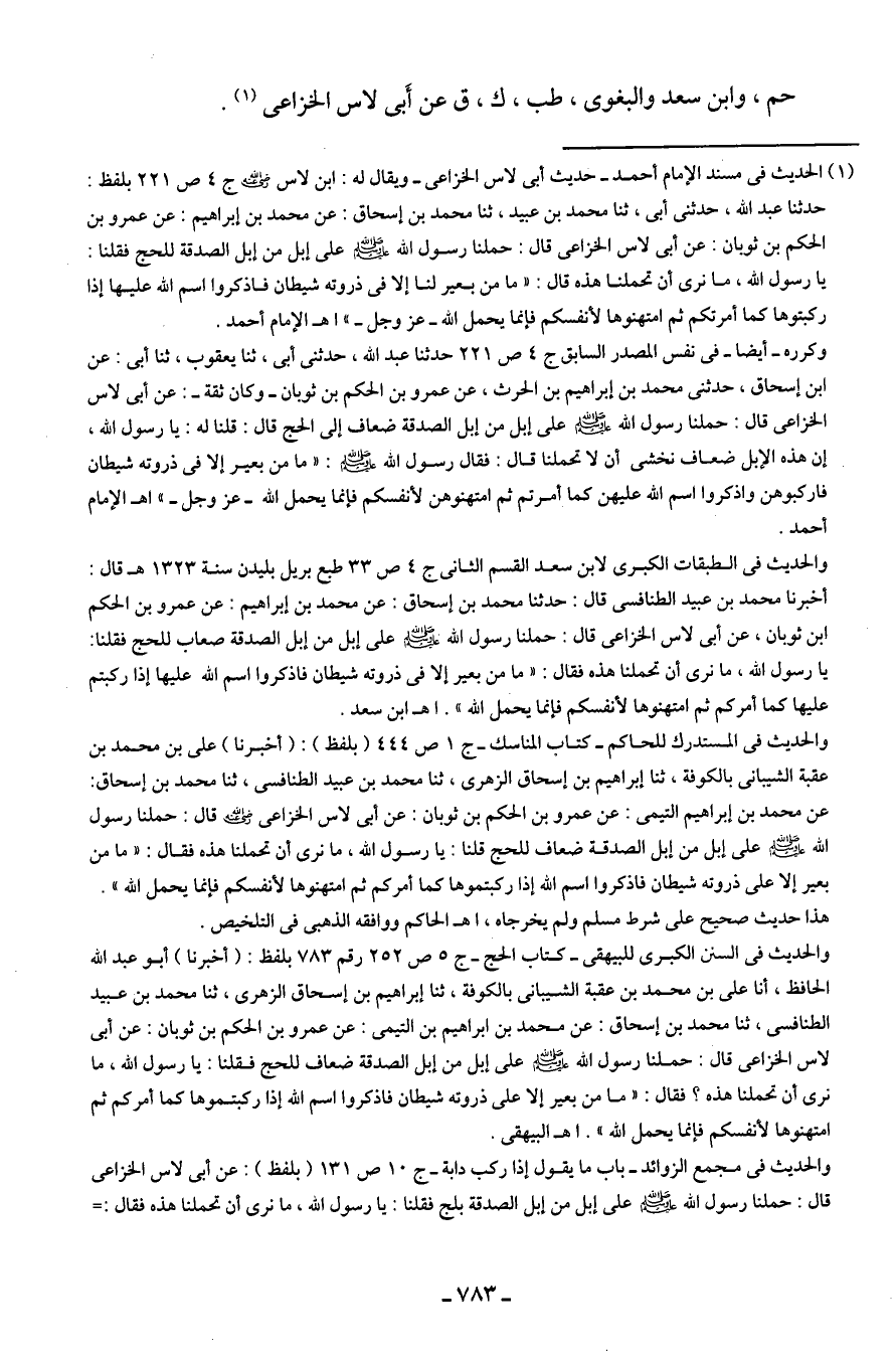 والحديث في الطبقات الكبرى لابن سعد القسم الثاني ج 4 ص 33 طبع بريل بليدن سنة 1323 هـ قال: أخبرنا محمَّد بن عبيد الطنافسى قال: حدثنا محمَّد بن إسحاق: عن محمَّد بن إبراهيم: عن عمرو بن الحكم بن ثوبان، عن أبي لاس الخزاعى قال: حملنا رسول الله - صلى الله عليه وسلم - على إبل من إبل الصدقة صعاب للحج فقلنا: يا رسول الله، ما نرى أن تحملنا هذه فقال: "ما من بعير إلا في ذروته شيطان فاذكروا اسم الله عليها إذا ركبتم عليها كما أمركم ثم امتهنوها لأنفسكم فإنما يحمل الله". اهـ ابن سعد.