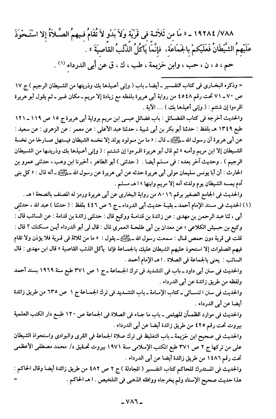 والحديث في صحيح ابن خزيمة - باب التغليظ في ترك صلاة الجماعة في القرى والبوادى واستحواذ الشيطان على من تركها ج 2 ص 371 طبع الكتب الإسلامي سنة 1971 بيروت تحقيق د / محمَّد مصطفى الأعظمى نحت رقم 1486 من طريق زائدة أيضًا عن أبي الدرداء.