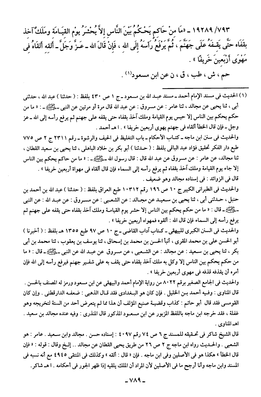 793/ 19289 - "مَا مِنْ حَاكِمٍ يَحْكُمُ بَينَ النَّاسِ إِلا يُحْشَرُ يوْم القِيَامَة ومَلَكٌ آخِذٌ بقَفَاه حَتَّى يَقِفَهُ عَلَى جَهَنَّمَ، ثُمَّ يَرْفَعُ رَأسَهُ إِلَى اللهِ، فَإِنْ قَال الله -عَزَّ وَجَلَّ- ألقِهِ ألقَاهُ في مَهْوَى أَربَعِينَ خَريفًا".