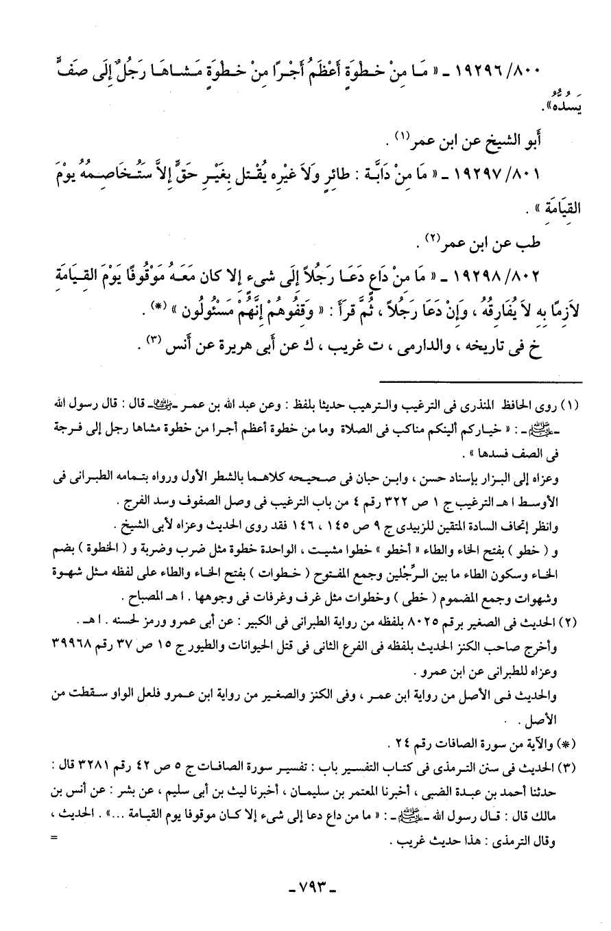 801/ 19297 - "مَا مِنْ دَابَّة: طائِرٍ وَلَا غيرِه يُقْتل بِغَيرِ حَق إِلَّا سَتُخَاصِمُهُ يوْمَ القِيَامَة".