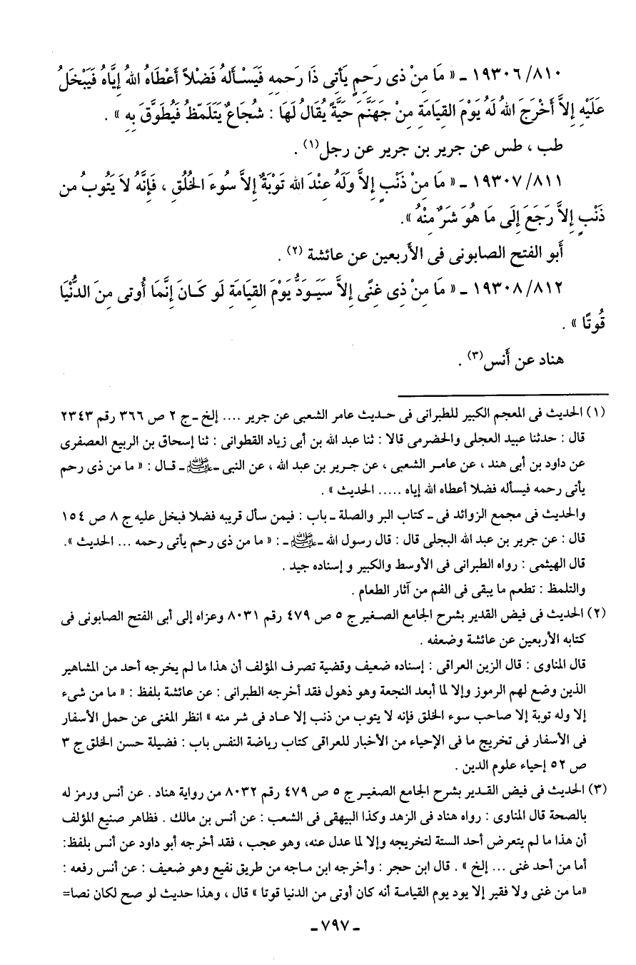 (¬1) الحديث في المعجم الكبير للطبرانى في حديث عامر الشعبيّ عن جرير. إلخ - ج 2 ص 366 رقم 2343 قال: حدثنا عبيد العجليّ والحضرمى قالا: ثنا عبد الله بن أبي زياد القطوانى: ثنا إسحاق بن الربيع العصفرى عن داود بن أبي هند، عن عامر الشعبي، عن جرير بن عبد الله، عن النبي - صلى الله عليه وسلم - قال: "ما من ذي رحم يأتي رحمه فيسأله فضلا أعطاه الله إياه. . الحديث".