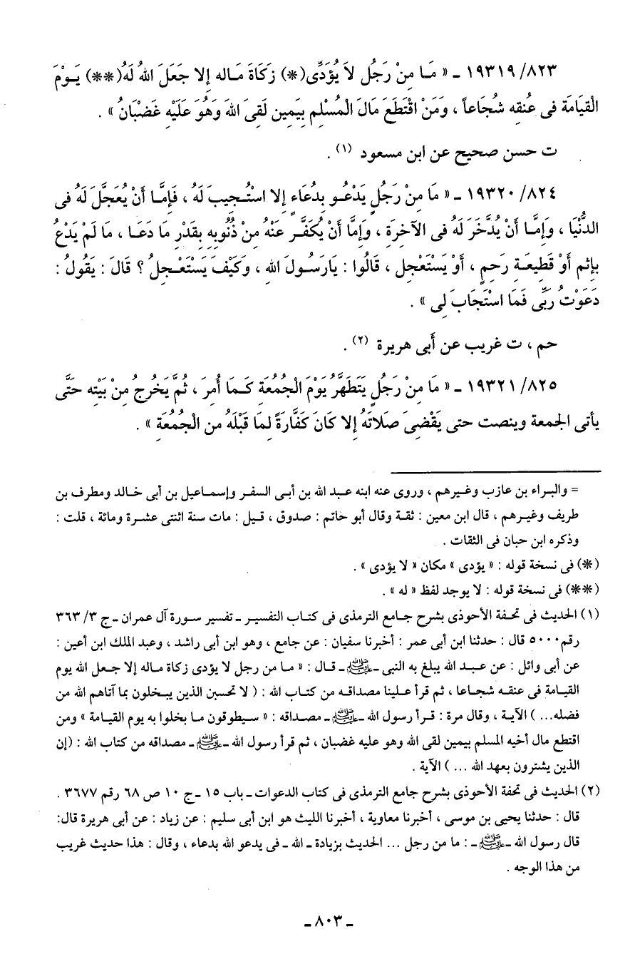 823/ 19319 - "مَا مِنْ رَجُلٍ لَا يُؤَدِّي (*) زَكَاةَ مَاله إِلا جَعَلَ اللهُ لَهُ (* *) يَوْمَ الْقيَامَة في عُنُقِه شُجَاعًا، وَمَنْ اقْتَطَعَ مَال الْمُسْلِم بِيَمِين لَقِيَ اللهَ وَهُوَ عَلَيهِ غَضْبَانُ".