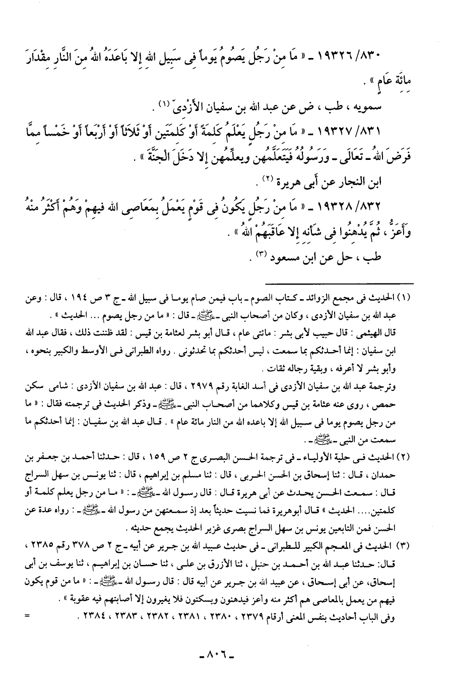 830/ 19326 - "مَا مِنْ رَجُل يَصُومُ يَومًا في سَبِيل اللهِ إِلا بَاعَدَهُ اللهُ مِنَ النَّارِ مِقْدَارَ مِائِة عَامٍ".