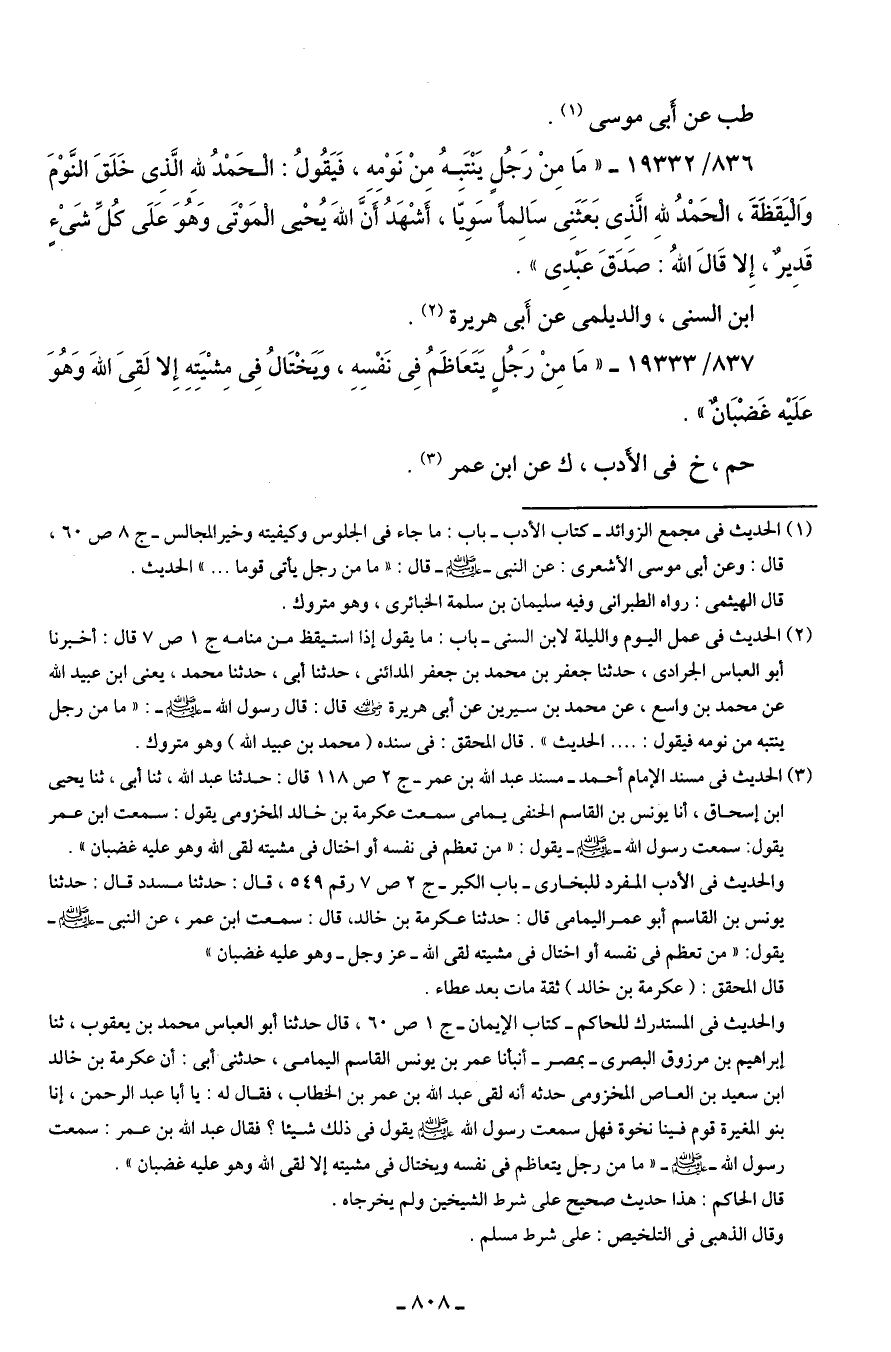837/ 19333 - "مَا مِنْ رَجُل يَتَعَاظَمُ في نَفْسِهِ، وَيَخْتَالُ في مِشْيَتِهِ إِلا لَقِيَ اللهَ وَهُوَ عَلَيه غَضْبَانٌ".